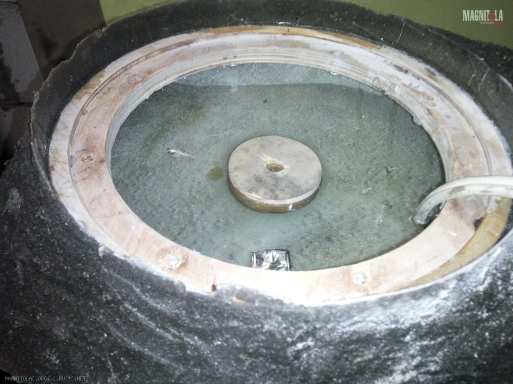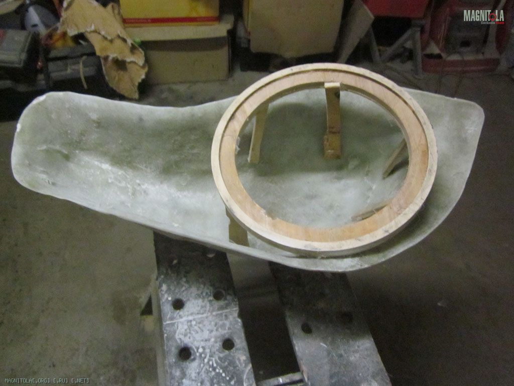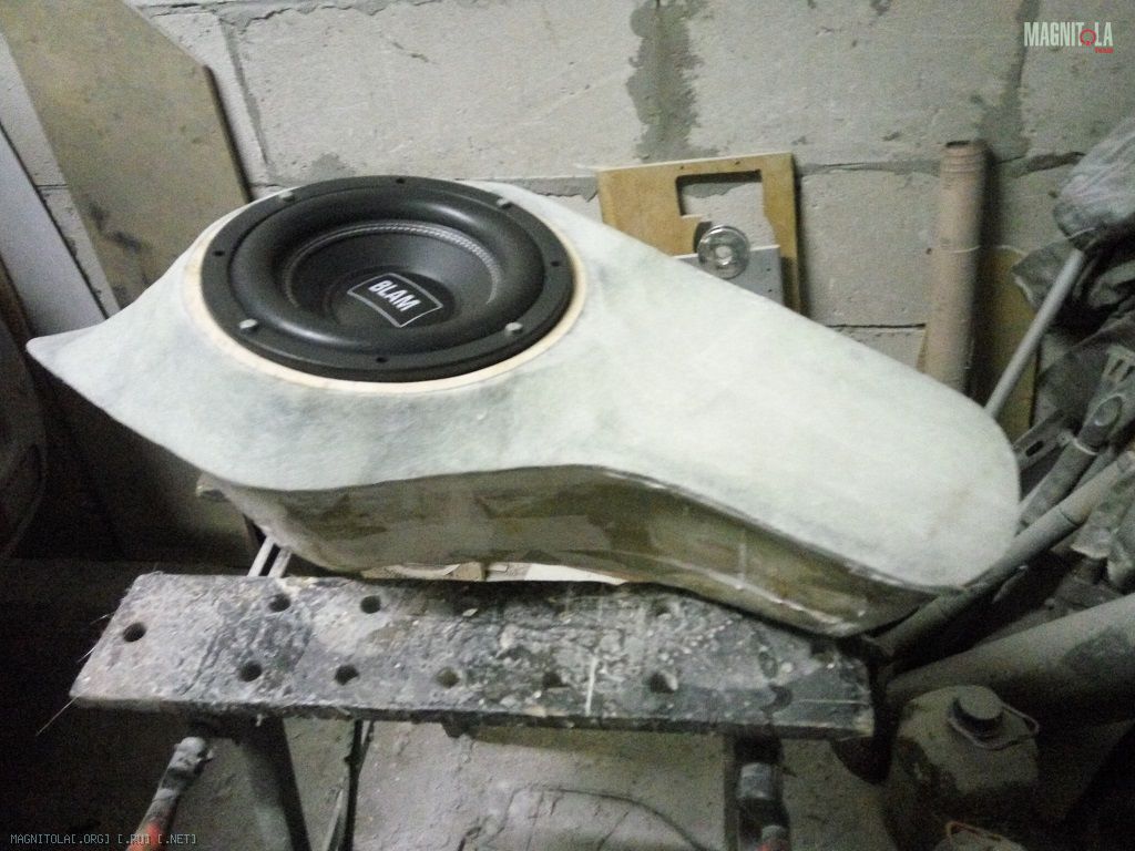 Продолжаю про сабвуфер. Накидал поверх первого слоя 450гостекломата, получилось слоя 4 для ровной поверхности. Поставил динамик, естественнона болтах и закладных гайках. И даже послушал у себя в машине от алпайна М12 ))