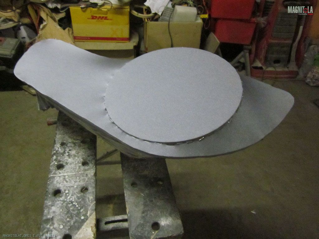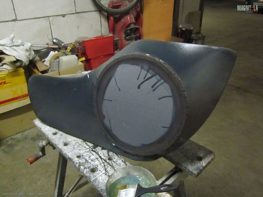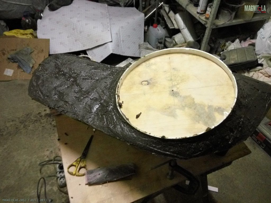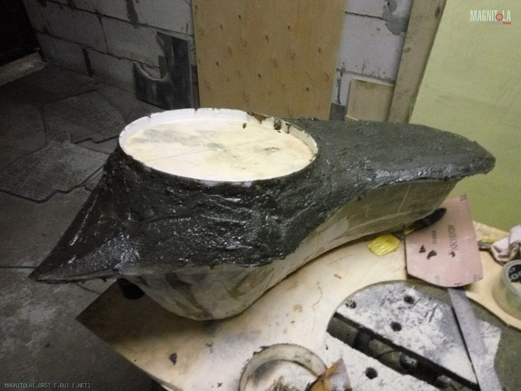 Вырезал кружок, приделал к нему бортик и накидал килограммадва полиэфирки с древесно-композитными опилками из шлифмашины. Замучилсявышкуривать потом это чудо )) Дальше шпатлевка со стеклом, финишная – и вуаля,саб готов к обтяжке и установке гриля (гриль пока существует только у меня ввоображении, но это вопрос одного вечера)