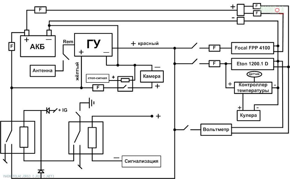 Схема расключки магнитолы, камеры, усилителей, всех выключателей и так далее представлена на схеме ниже. Единственное, что нужно исправить, так это добавить реле на включение усилков после активации магнитолы. Иначе пока магнитола не загрузится, в системе слышны сильные шумы. В следующей вариации это исправлю, добавлю реле. Все реле будут транзисторными с потреблением всего 6 мА!