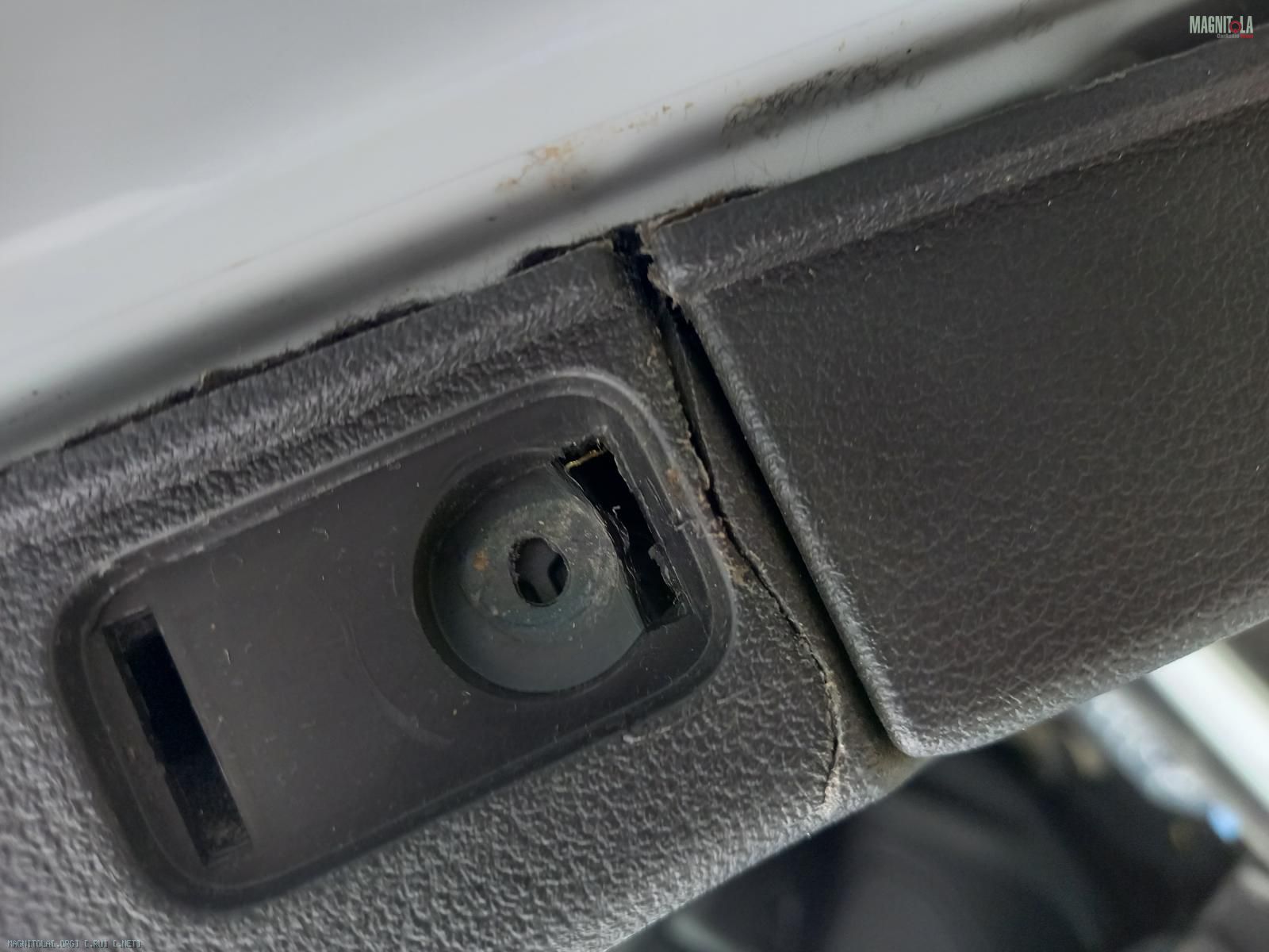 Обклей наружу двери под картой черным паролонон. Он покажет .Трещину запаять изнутри тонкой насадкой на фен полоской,отрезанной от обивки,предварительно разделав трещину под 45 градусов