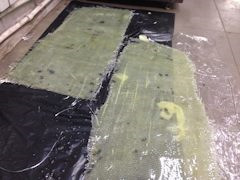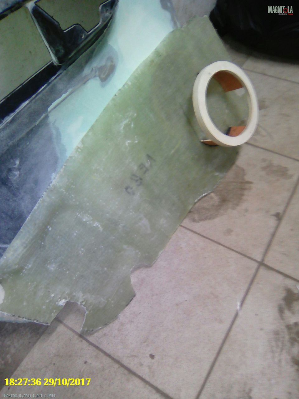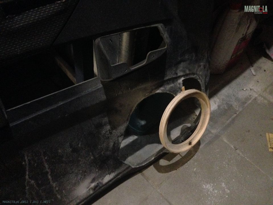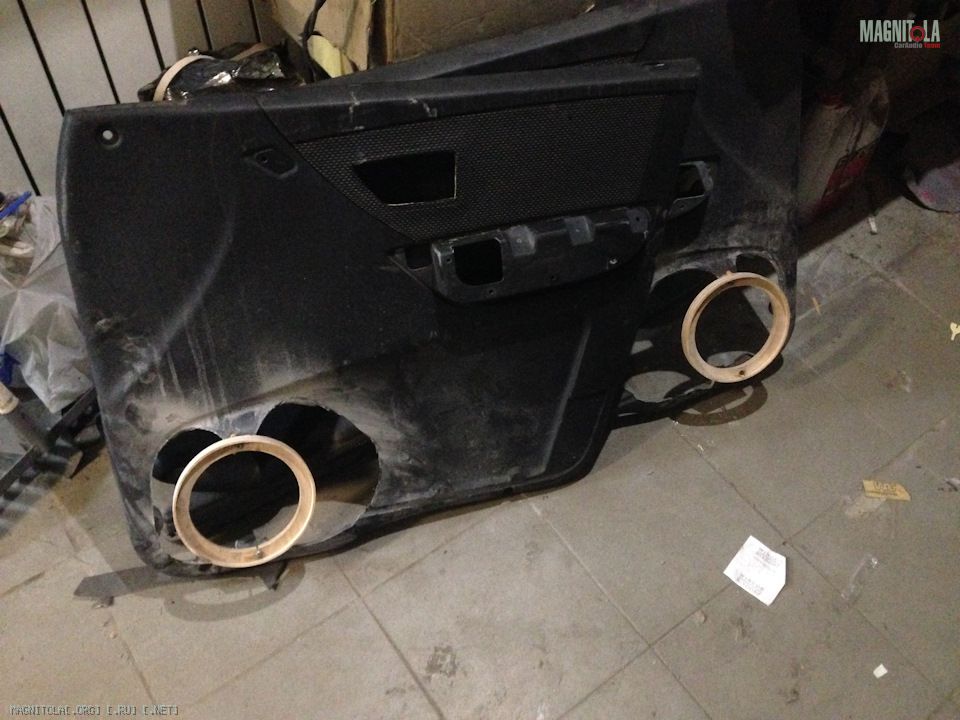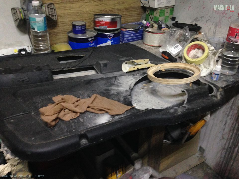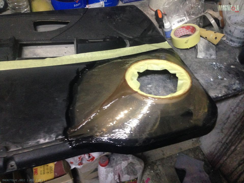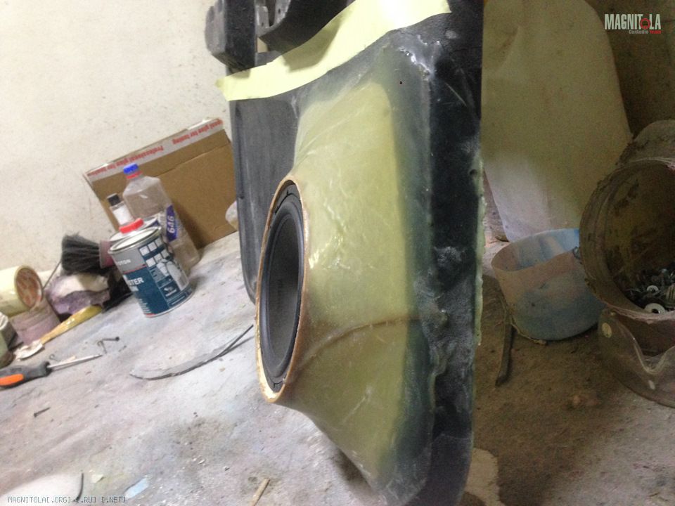 Штатная акустика 13 см и мимо обшивки смотрит, поэтому щиты из стекловолокна и на них подиумы под мидбасы. Подиумы с расширением, получились в виде усеченного конуса.