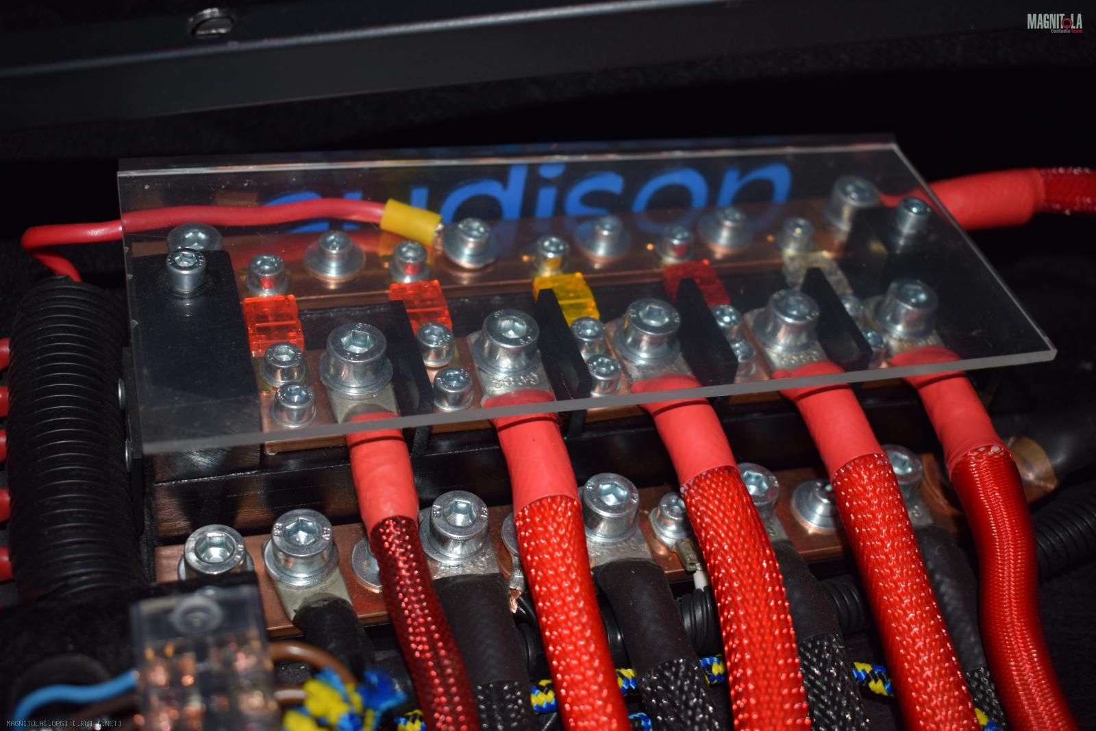 Силовая проводка- собственно сама колба или корпус главного предохранителя изготовлена из текстолита,оргстекла,гермовводы. Прикручен к металлическому кронштейну,а тот к крепежу аккумулятора. Провод ПУГВ 1*50 кв мм в змейке и гофре. Проходит моторный щит через гермоввод,там где заглушка сцепления (просверлена для гермоввода),у меня веста АМТ. Наконечники все ПАЯЮТСЯ. Далее идет по левому порогу в багажное отделение. (все провода закреплены)