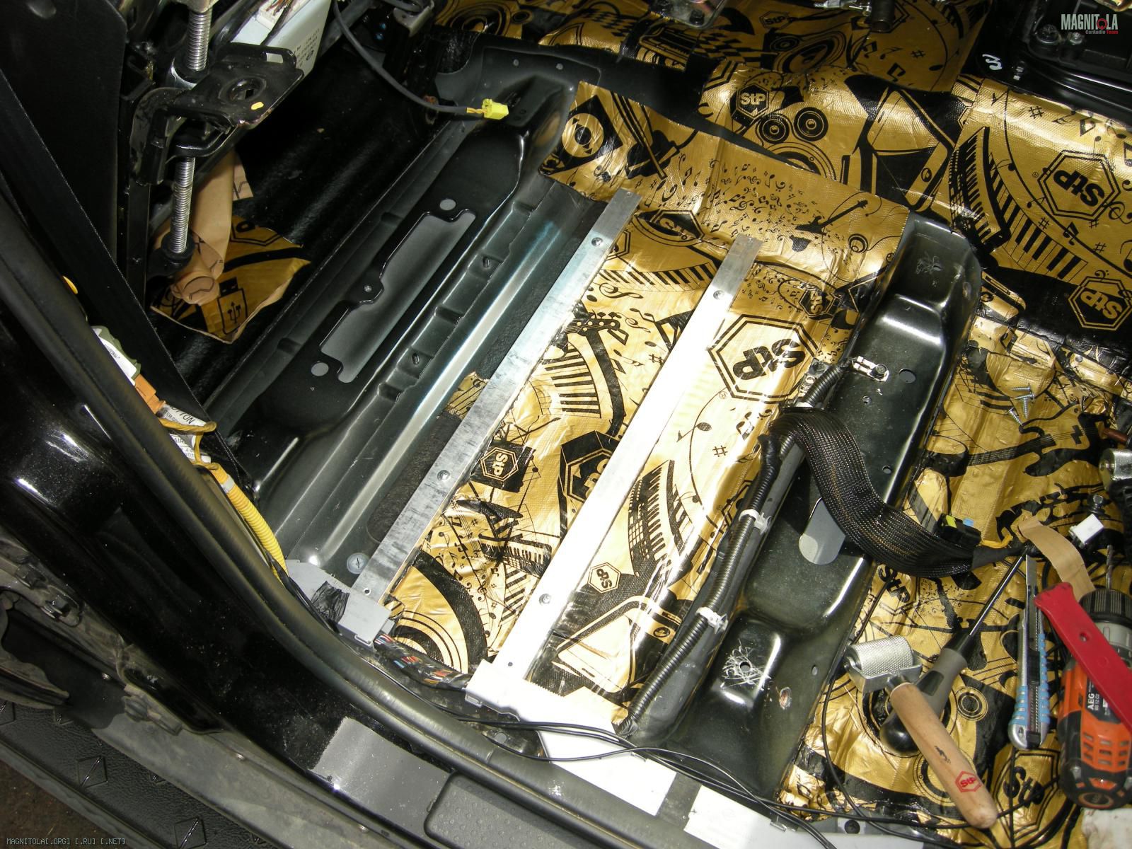 Попутно определил место усилителю - под пассажирским сидением спереди. Встает нормально, сиденьем не цепляется. Также прикинул, как пойдет сила и остальная проводка от ГУ к усю и от уся к Динамикам. Вроде как все получается по прикидкам хорошо.