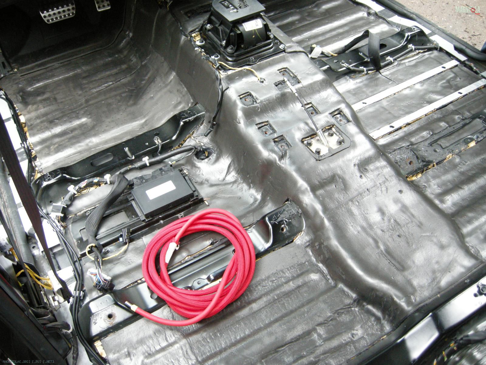 Далее по полу протянул до усилителя. Там, где провод проходил через короб жесткости, края отверстия были изолированы черной пластиковой гофрой.