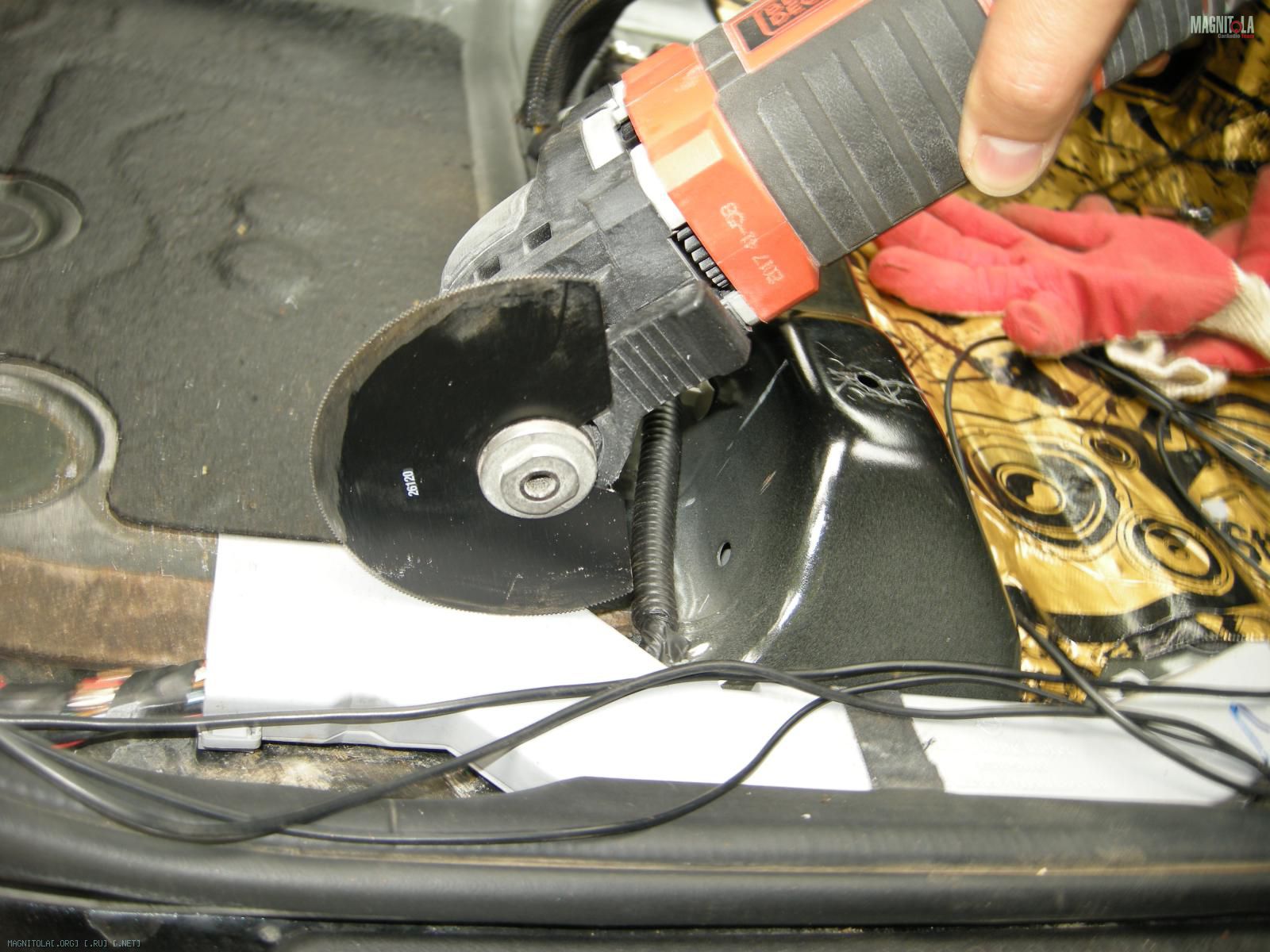 Место под усилитель определено. Жить и работать он будет под передним пассажирским сидением. Примеряем, снимаем ковер, убираем, что мешает встать на место. Пришлось немного подрезать пластиковый короб. Тут очень помог реноватор. Замечательный инструмент, особенно там, где тяжело подлезть.