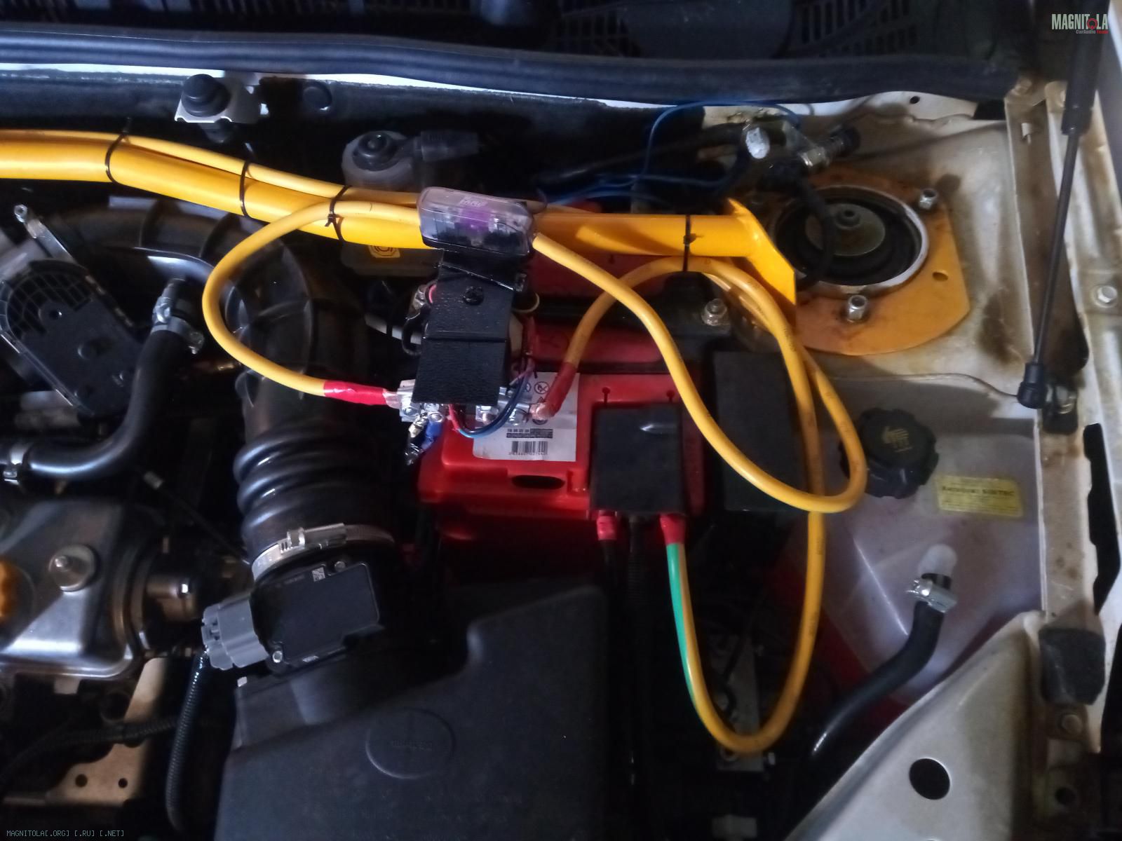 Силовое реле SWAT SPR-200 и контроллер ДХО ( Дневные Ходовые Огни) 24Вт были установлены чуть выше основного аккумулятора. Разводка сделана медным силовым проводом 1*25 кв.мм. Аккумулятор разместился с правой стороны на подставке, жестко закрепленной к полу багажного отсека. Продлена трубка выхода газов к верхней части багажника. При желании её можно вывести в бок через заглушку под задний бампер. В багажном отделении установлен прерыватель массы.Вложение 1353293