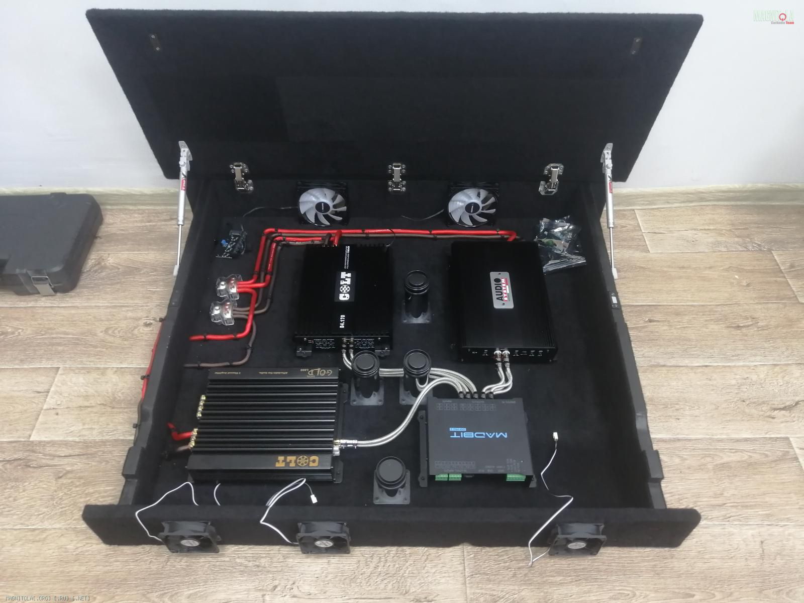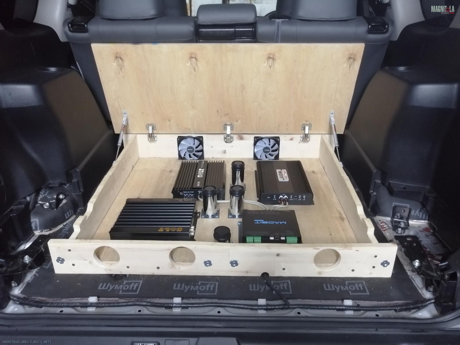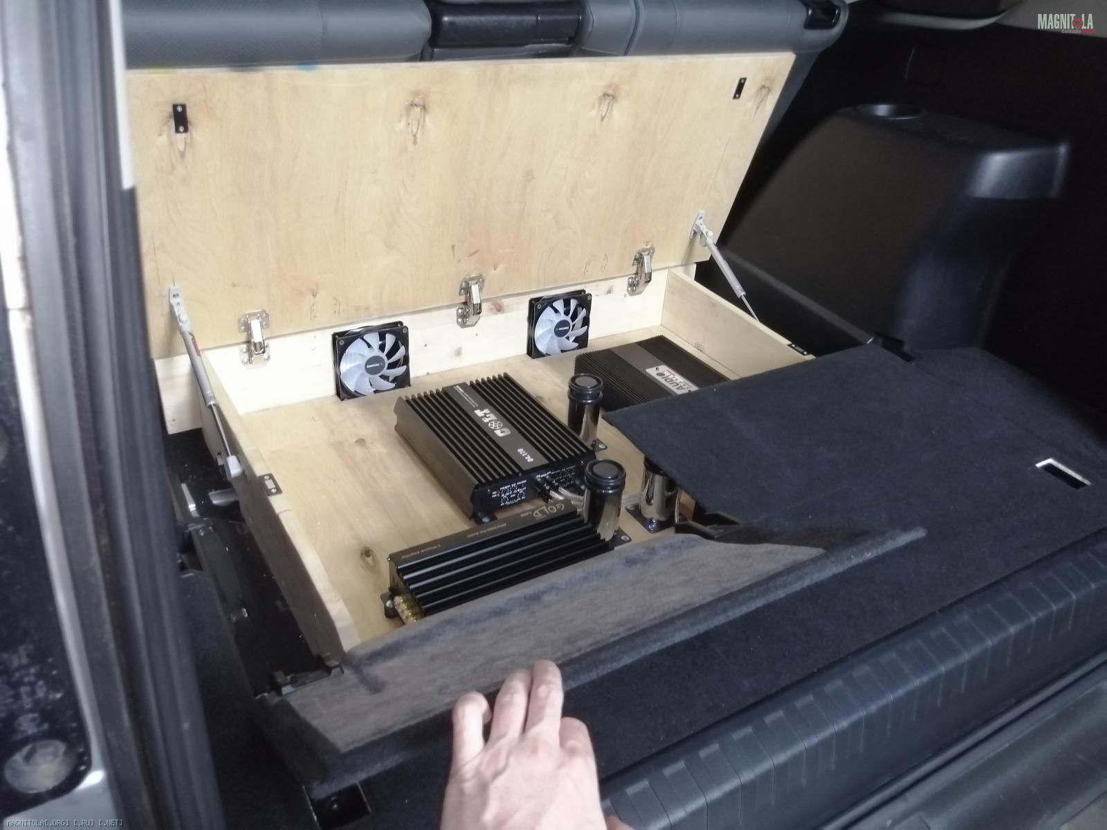 В общем получается такая картина, ящик планирую зашкурить, покрасить и обтянуть карпет шумофф аккустик. В закрытом положении думаю будет выглядеть как обычный багажник. Можно будет использовать его по прямому назначению. Функционал не должен пострадать, для этого поставил усиление, регулируемые по высоте мебельные ножки. Выглядит конечно не очень, зато очень удобно и функцию свою выполняют, пол не продавливается.
