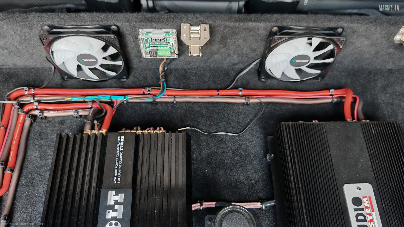 Датчик от термореле прилепил пока на один из усилков, который на миды и тыл, еще окончательно не решил, куда его прилепить, где температуру мерять, настроил на включение на 45 градусов. Понаблюдаю пока как будет работать, может потом поменяю место и температуру запуска кулеров. Надо посмотреть, какой из усилков будет сильнее греться и насколько. Пока система не собрана полностью, два из трех усилков не задействованы.