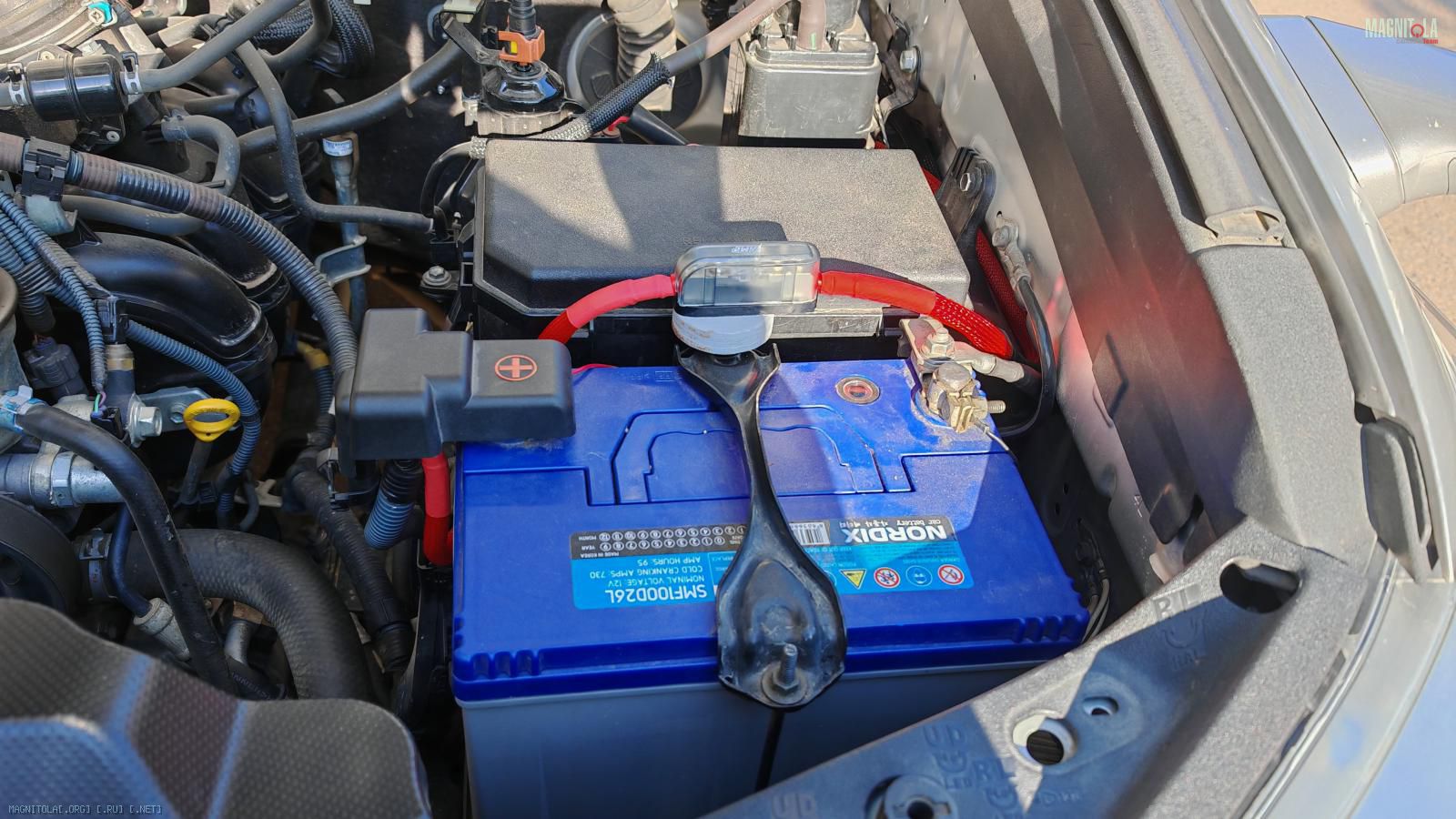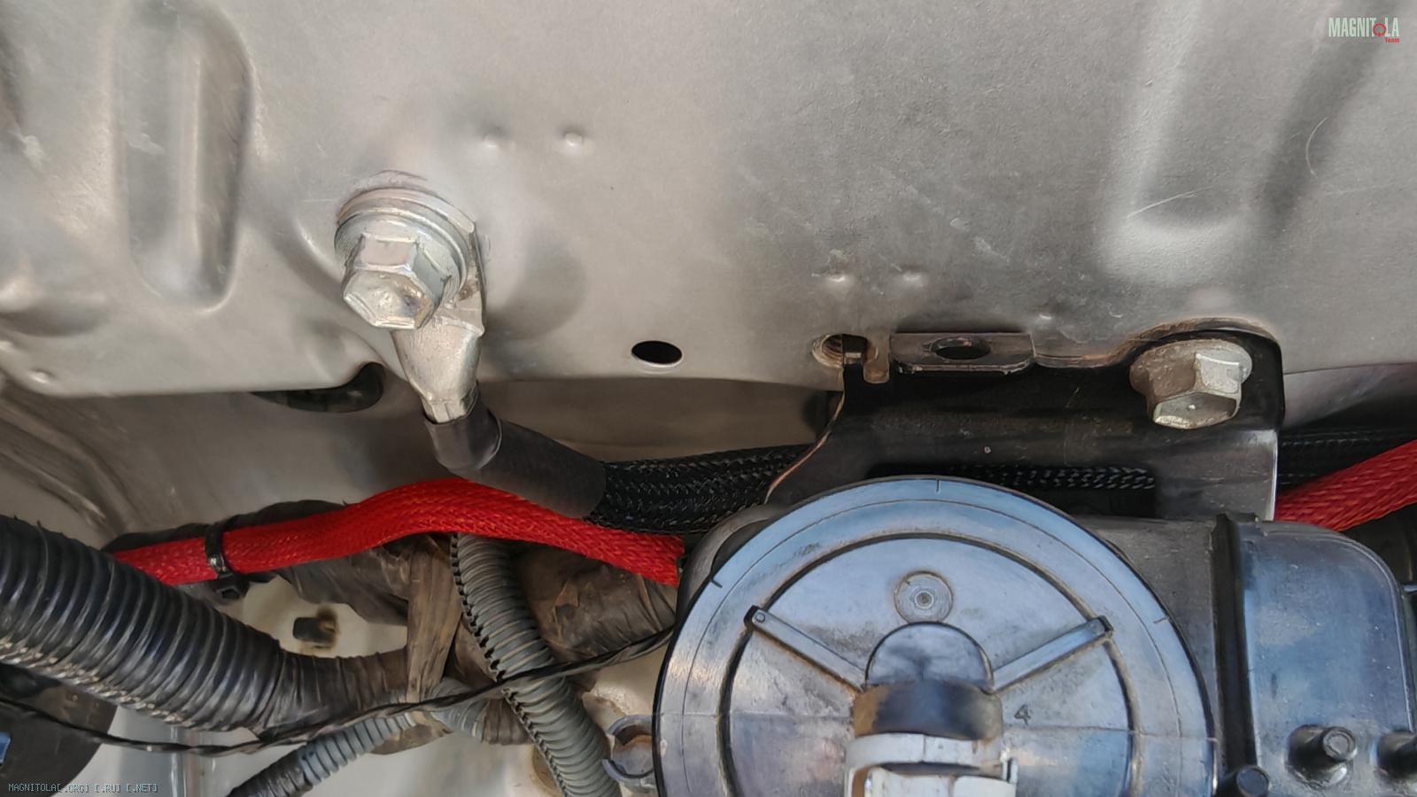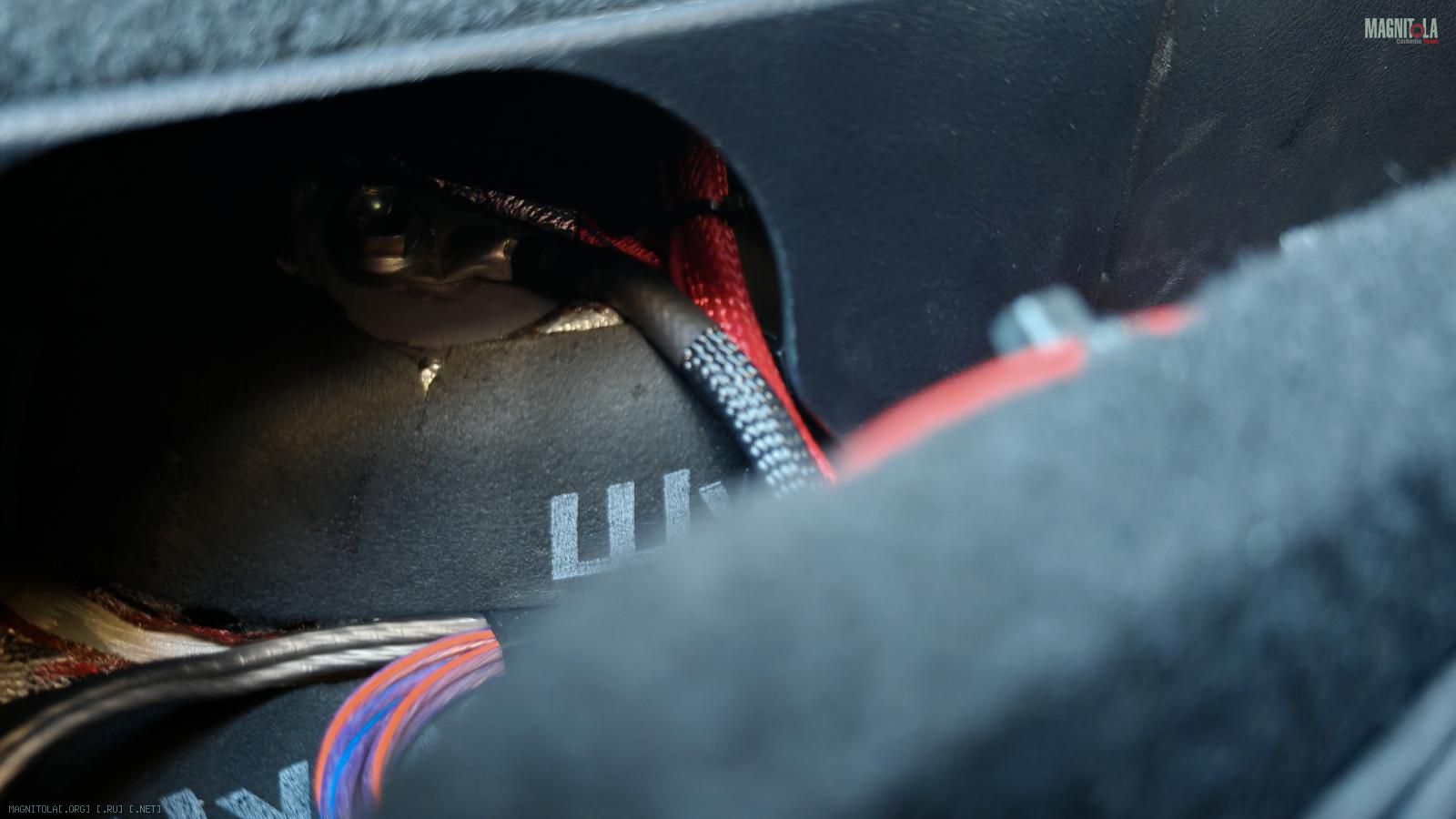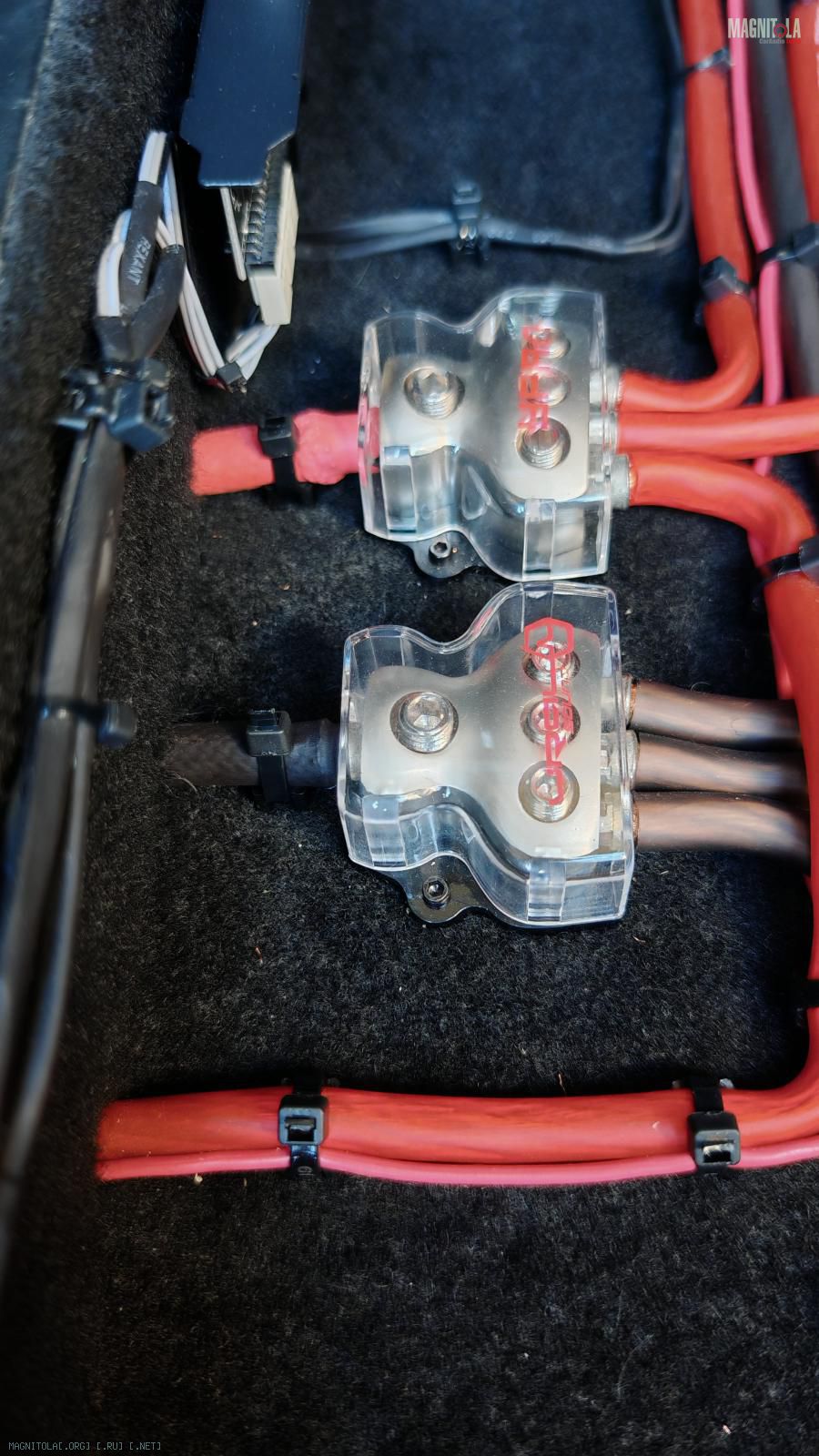 От аккумулятора под капотом кинул дополнительный минус на кузов. Плюсовой получилось засунуть в родную клемму аккумулятора. Единственно, не придумал еще, как лучше закрепить главный предохранитель. Пока временно закрепил на штыре от крепления аккума.