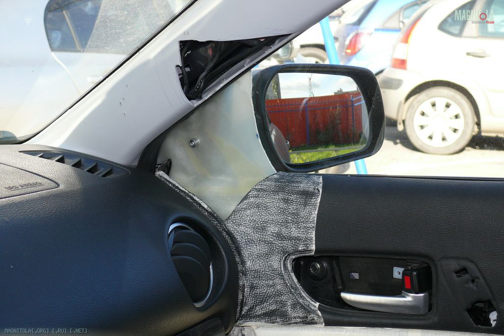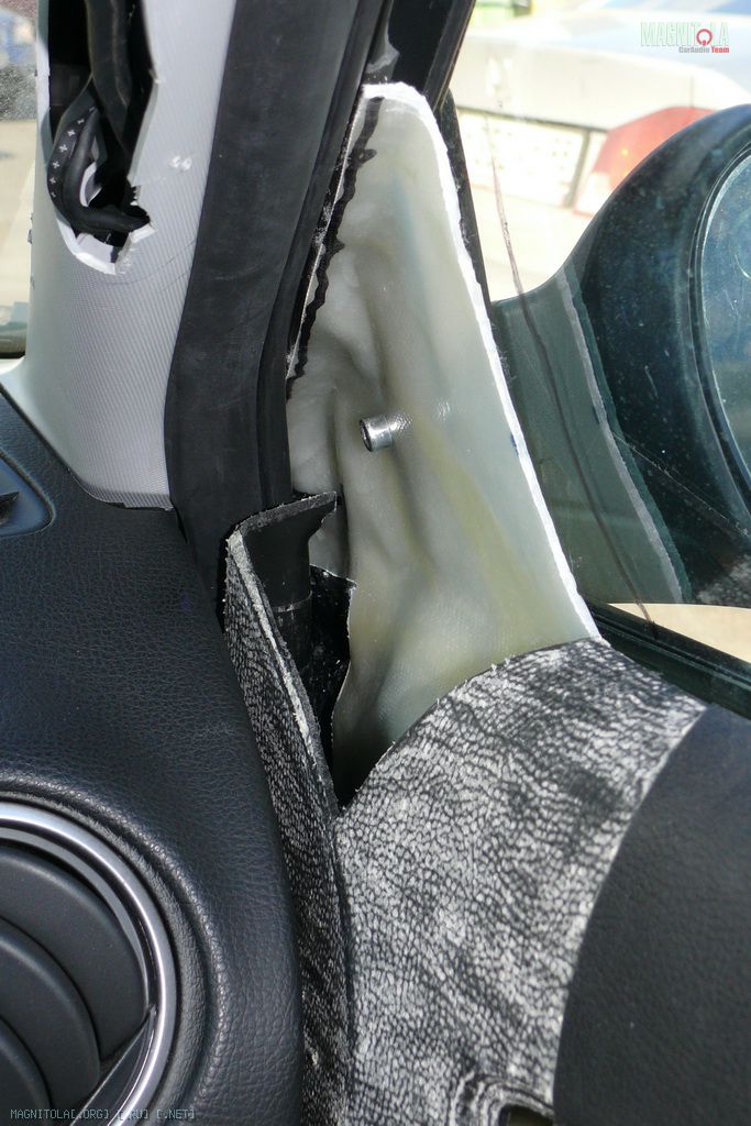 Ранее у меня уже были в них просверлены отверстия (когда ВЧ стояли в уголках дверей). Через эти же отверстия и протягивал. Обратите внимание, что в Мазде6 есть штатная защита кромок в месте протяжки проводов в двери (пластиковая окантовка). Ну и фото процесса.