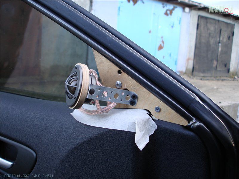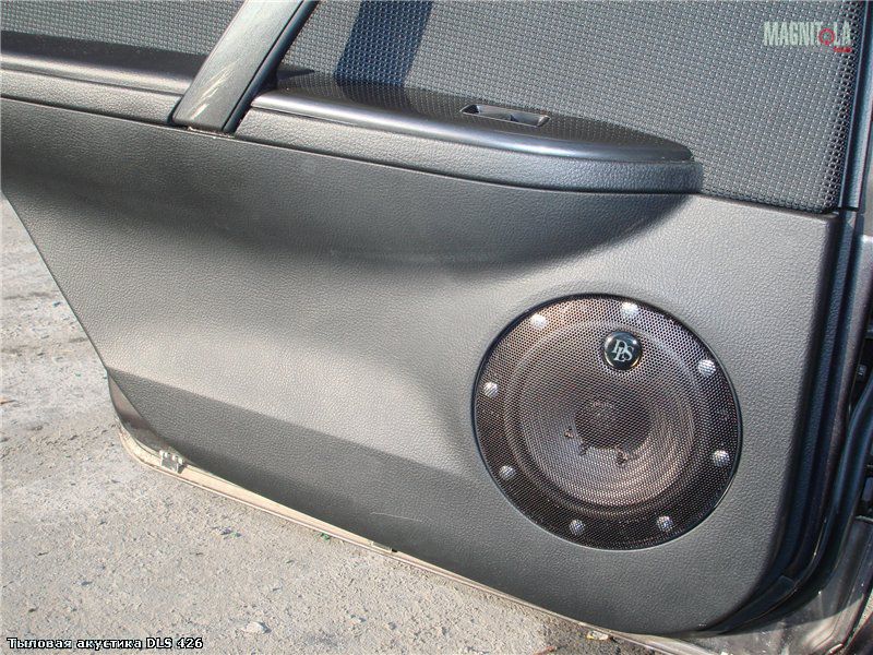 Акустика была поставлена можно сказать на штатные места. Для установки мидбасов, из фанеры были изготовлены переходные кольца. Кольца пришлось делать такой формы, что-бы перейти со штатных овалов на 16 см. динамики DLS R6A. Что-бы мидбасы не играли под обшивку они были установлены вровень с плоскостью внешней обшивки. Установочное кольцо динамиков устанавливается снизу динамика и переходные кольца были сделаны довольно высокими, что-бы после установки на них динамика он немного выступал за обшивку. Пришлось для этого порезать штатные защитные решотки. Они совпали по диаметру с установочным кольцом динамиков. Для лучшего звука свершу динамиков установлены стальные стабилизационные кольца DLS. Крепление дианмиков на саморезы. Задние динамики установлены аналогично.