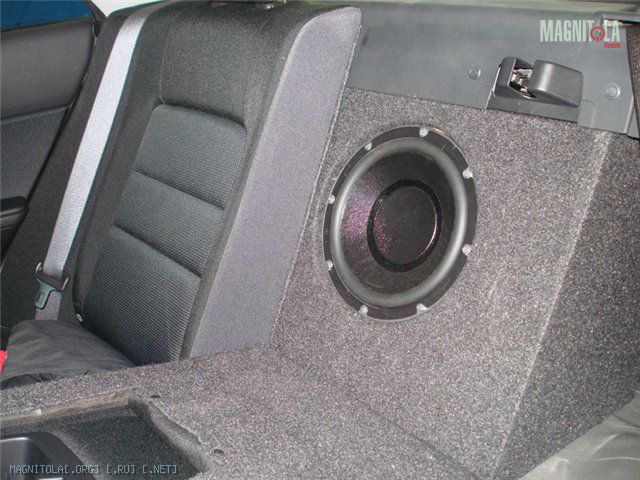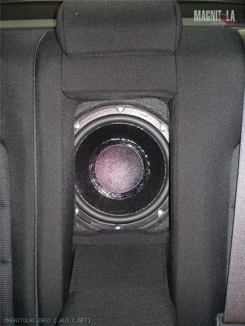 Для того что-бы саб играл в салон напрямую пришлось вырезать отверстие за подлокотником заднего сидения. Получилось неплохо, впоследствии нужно будет установить сетку, для исключения повреждения диффузора саба неостородными седоками.