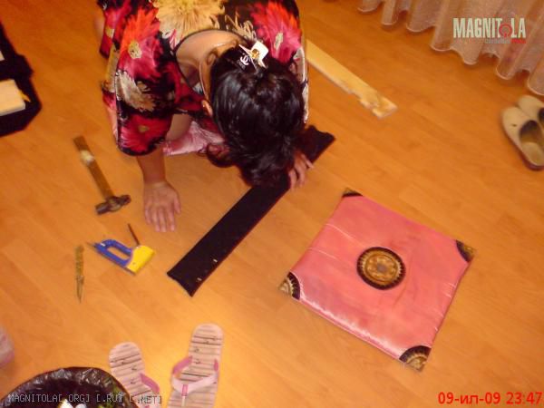 Конечно всё происходило вечером, и не всё гладко пошло, как хотелось бы. Но в итоге пару боковушек она обтянула. Удивляюсь, как соседи с низу не вызвали милицию:) Осталось ещё пару боковин обтянуть, и можно собирать ящик. Вот такой семейный кружок очумелые ручки.:laugh1: