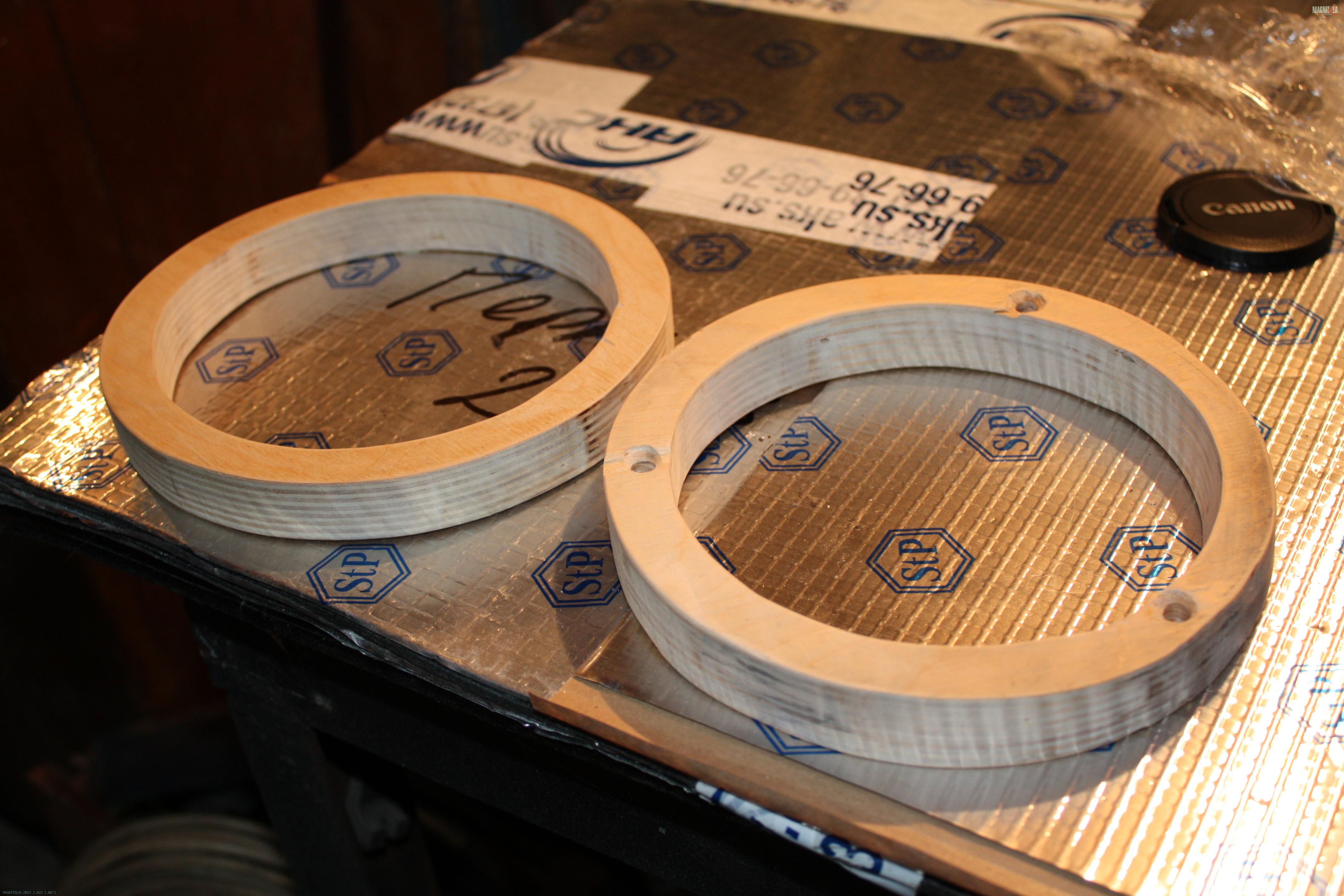 Далее выпилил кольца для динамиков из 22мм фанеры, доворот получился маленьким из-за конструкции обшивки.