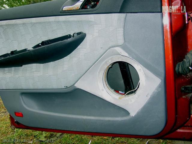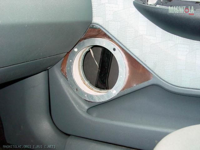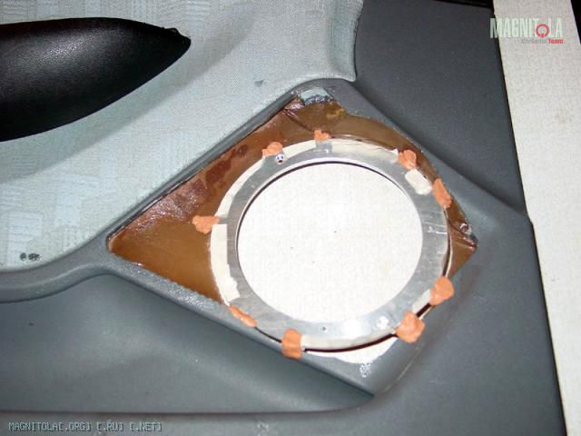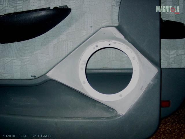 Итак, расширил дырку в обшивке дверии приклеил сзади чулок. Обшивка двери не плоская, снизу будет заподлицо, а сверху выдается вперед по отношению к динамику