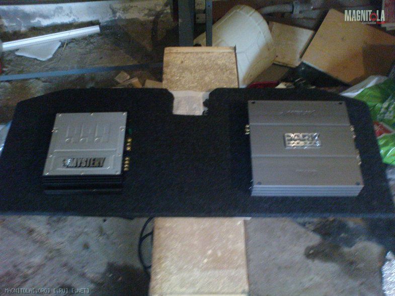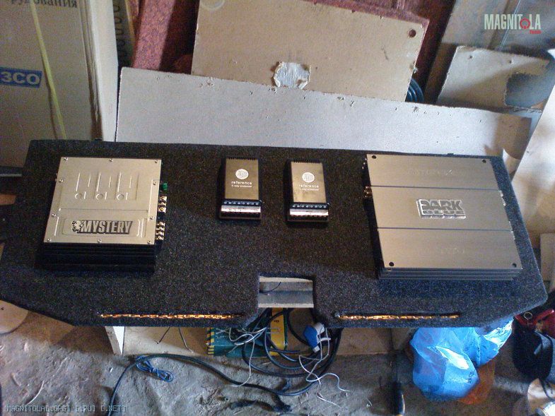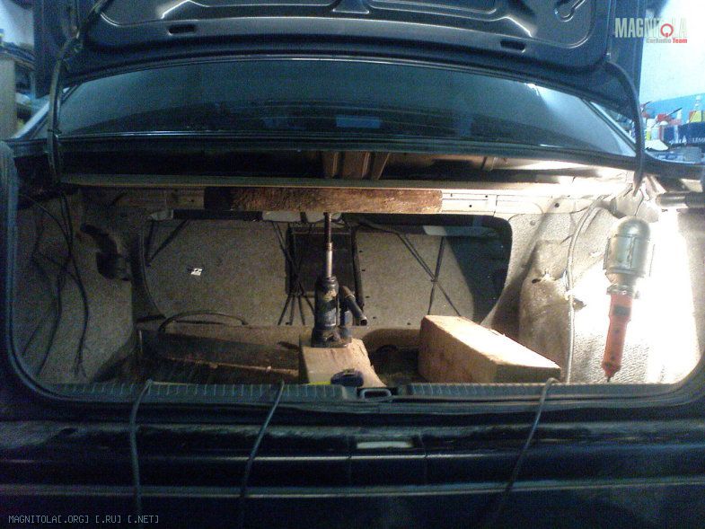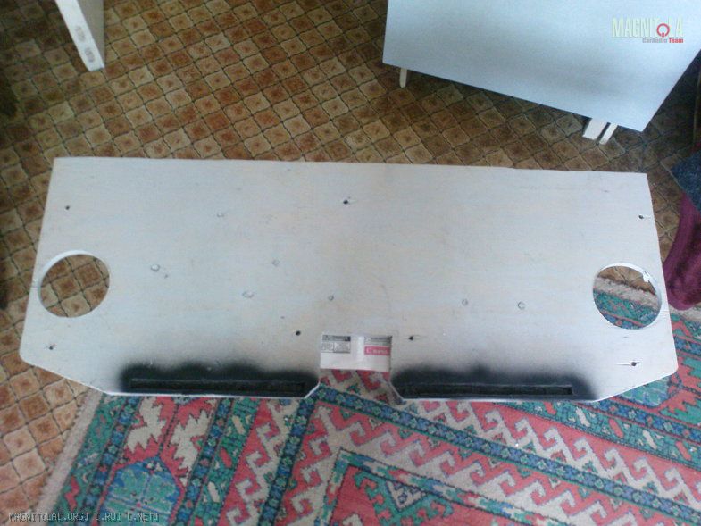 Далее начал раздумывать где разместить все усилители! Подумав немножко пришёл к выводу, что их самое оптимальное место под полкой в багажнике. Но прикручивать усилители к голому металу не хотелось, не правильно как-то это, не по феньшую так сказать! Купил лист фанеры 15мм и начал выпиливать подходящую форму. Вот так она держалась: