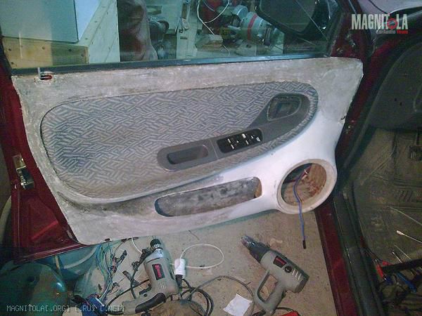 Мажу лаком проставки из МДФ, затем начинаю шумку клеить. Внутрь СТП толстый который с бумажной фольгой снаружи М2. Купил для обтяжки винил обтянул.