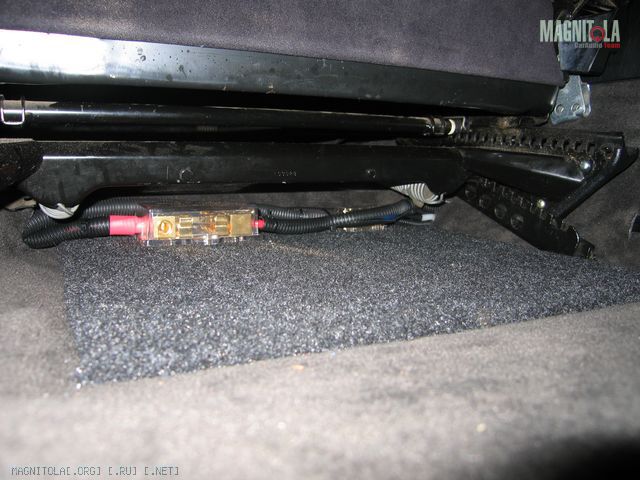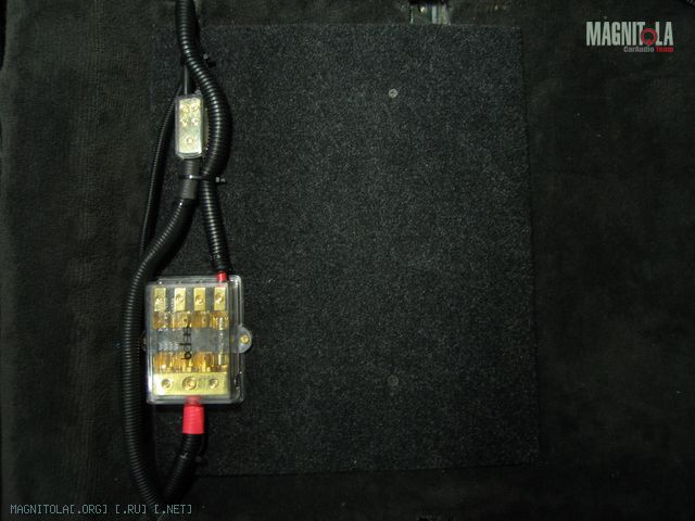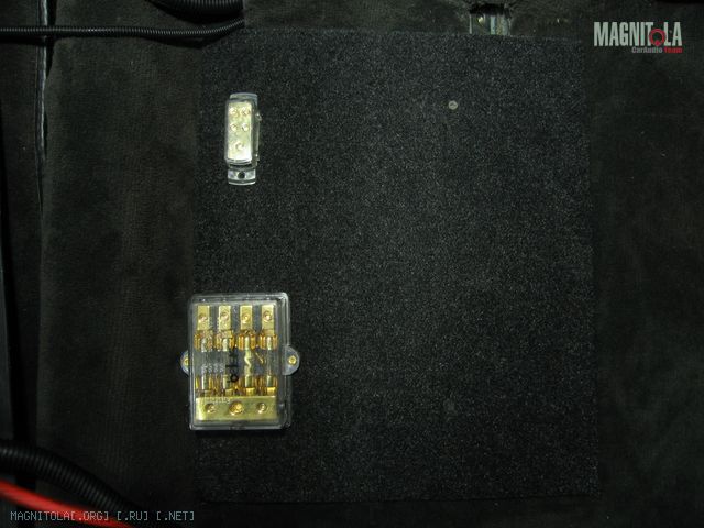 Площадка из 10 мм фанеры, обтянутая карпетом, с распределительными блоками и местом под 2-х канальный(позже) усилитель установлена под водительским сиденьем.