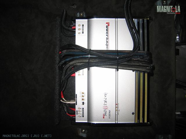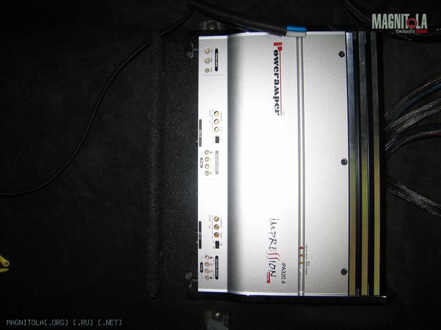 Под пассажирским сиденьем на фанеру 10мм установил и подключил 4-х канальный усилитель , провода работе кресла не мешают.