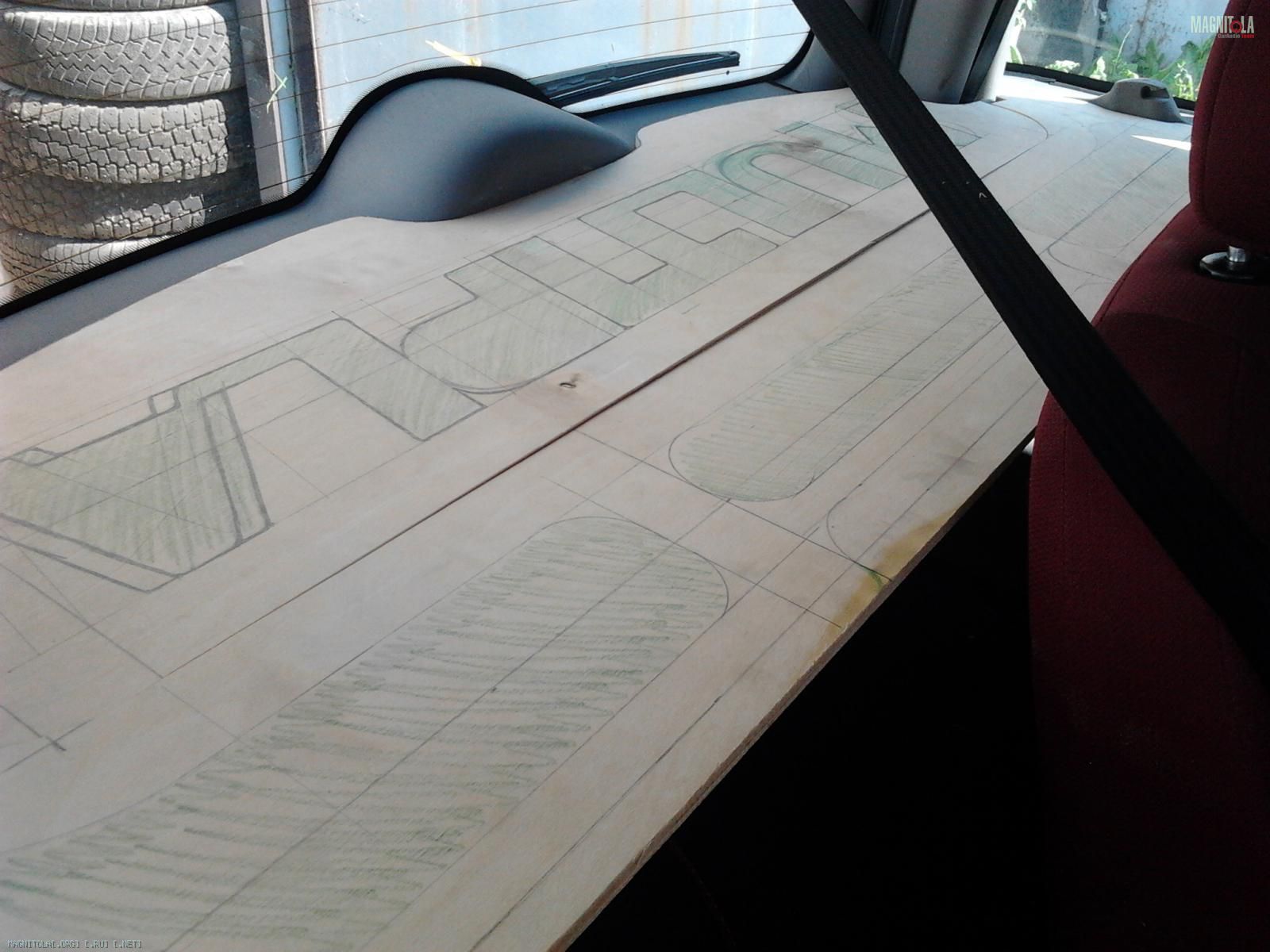 Тем временем прикинул размеры сабово-усилительного блока в багажнике. Сделал это при помощи безхозного куска столешки: