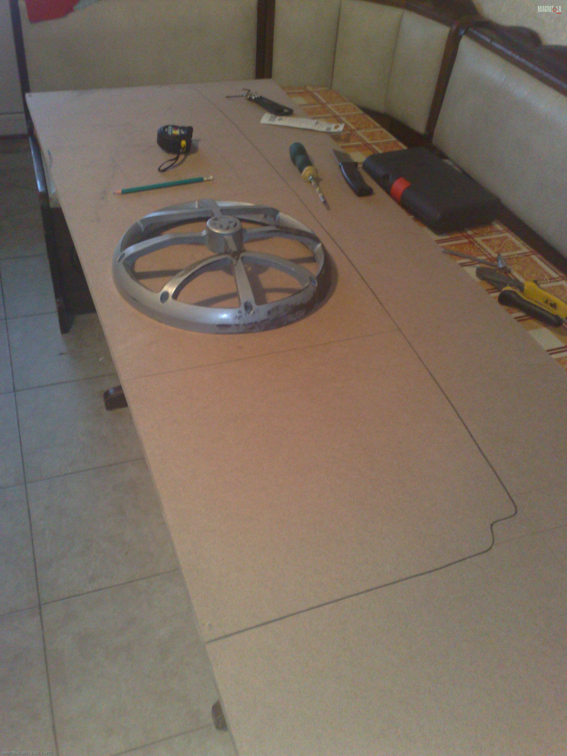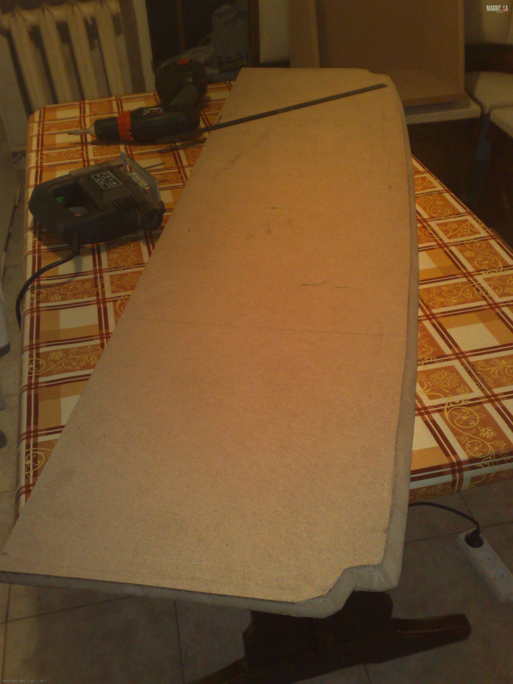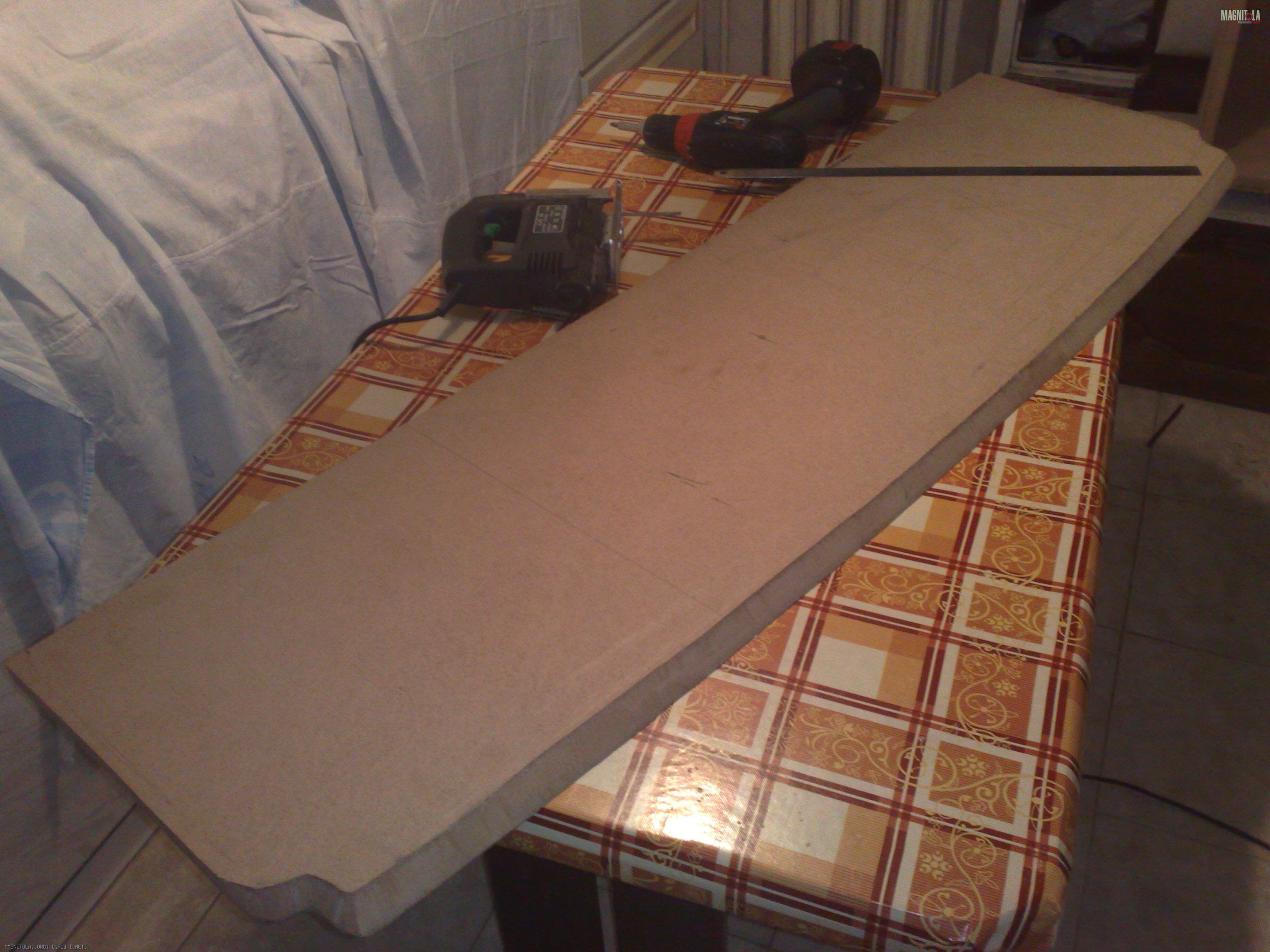 Первым делом я начал с изготовления полки, размеры тупо слизал со старой, купленной у неизвестного Джамшута давным давно, которая до сегодняшнего дня служила мне как дырки в багажник, через которые дует саб. Этот момент домашние пережили легко, поскольку орудовал я электролобзиком и недолго. Настоящий апокалипсис лишь приближался.......