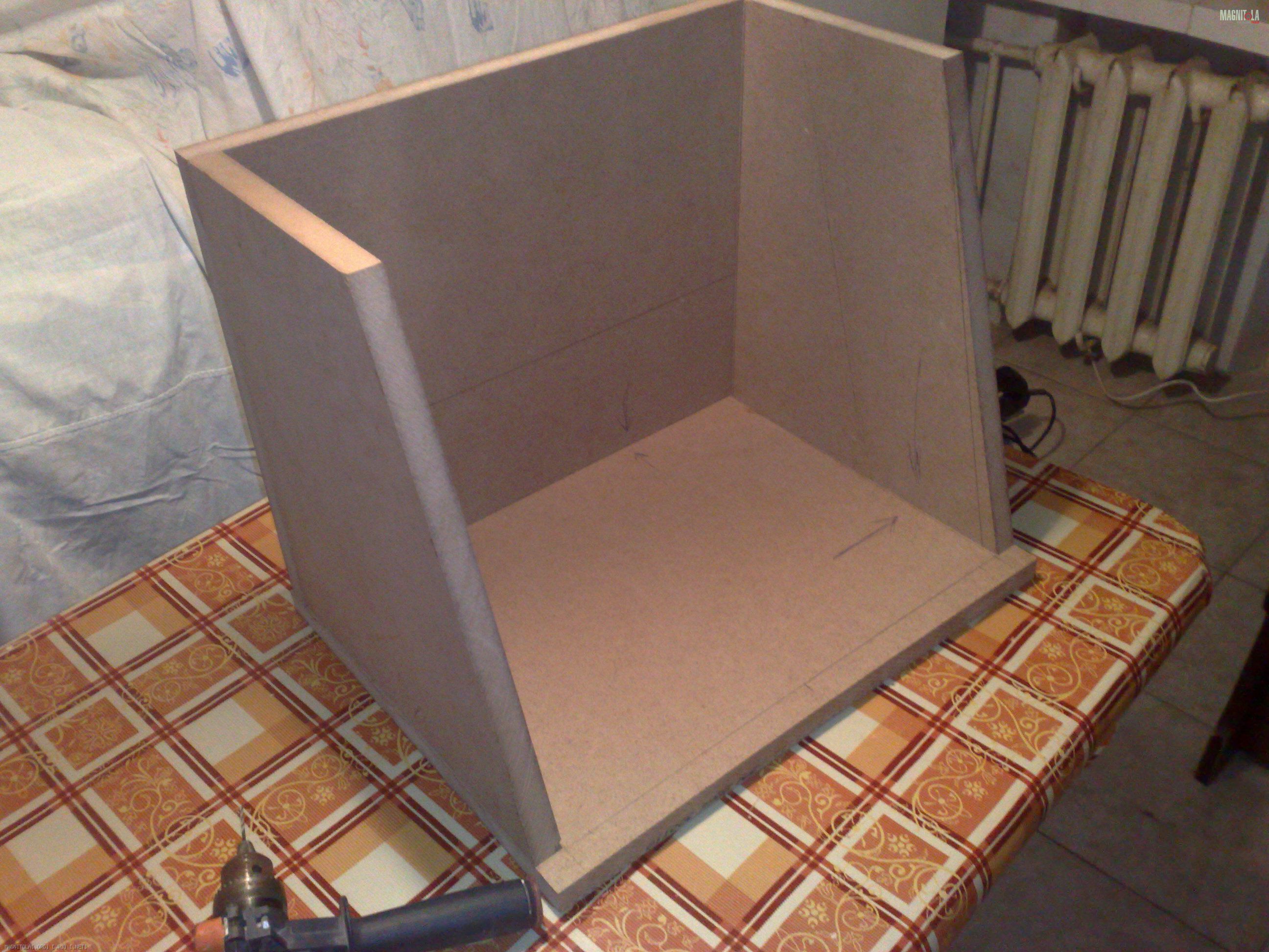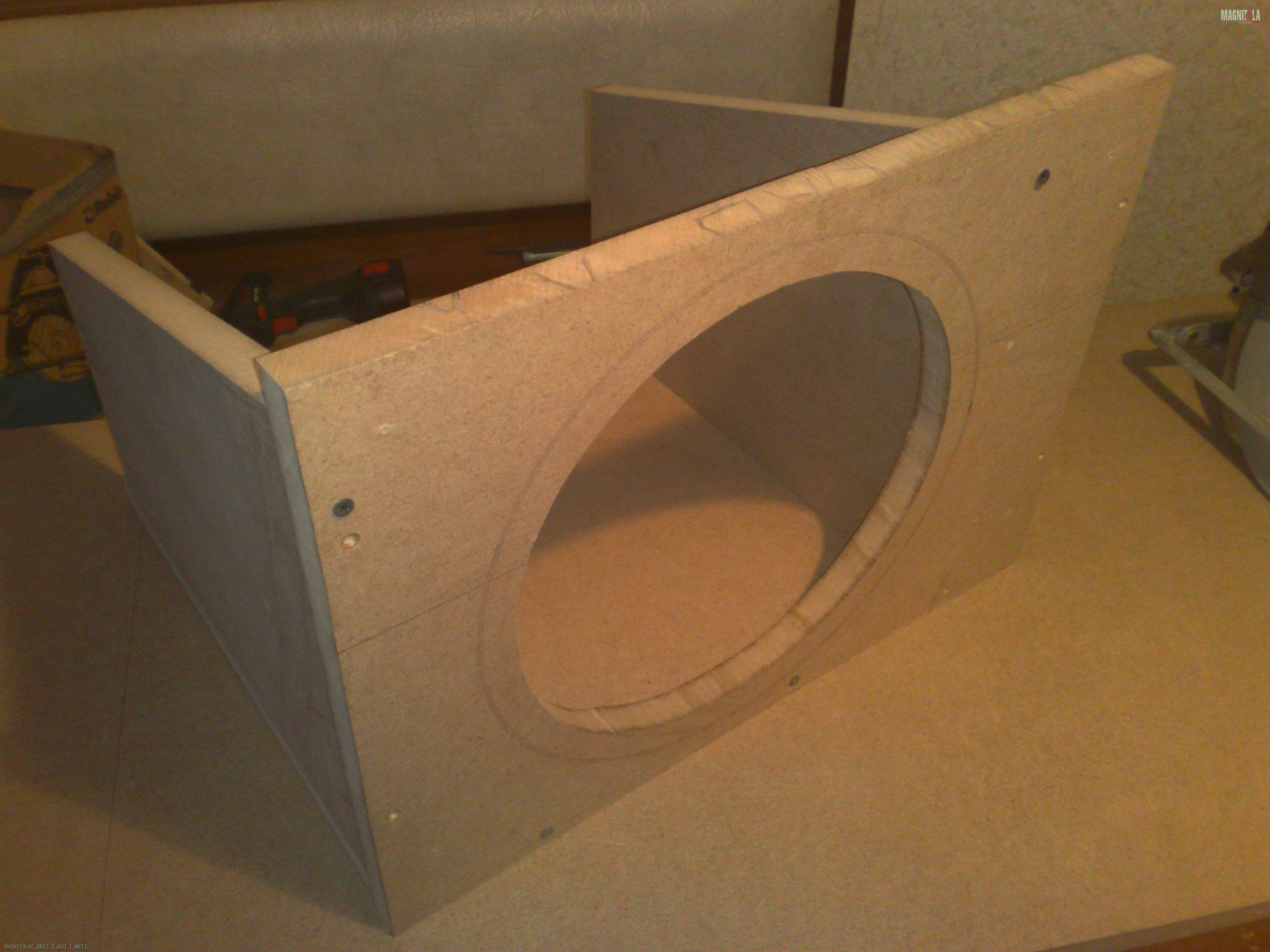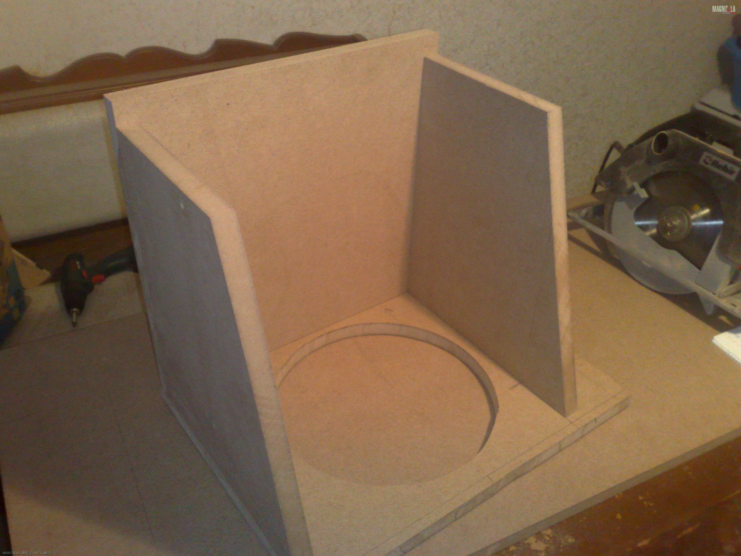 Короб я решил сделать 29,8л (получился 29,7) с настройкой фазика на 43гц, эти данные были в мануале ир12, ко всему прочему, у меня был такой ящик, и так как дин в нем играет меня очень радовало, недостаток ящика - узкий порт, 6.5см, который свистел как хотел. Посему порту быть 10.5см. несложный расчет показал длину порта 36см, что привело меня в уныние, в такой ящик он никак не хотел влазить, вернее хотел, но вылазил в совсем неудобном в моем случае месте - сбоку ящика. Но об этом позже.