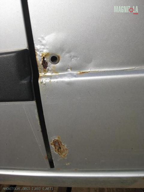 В общем, пару недель назад (или поболее уже) провел я давно запланированную ревизию правого переднего крыла и правой же передней двери. Первое вызывало подозрения в связи с частично отвалившейся накладкой-серпом (вода туда попадала давно, из-под пластика ржа стала видна), вторая - дверь - пару лет назад пострадала от моего первого пробного въезда в гараж, была пролечена, но пролечена криво и уже давно требовала повторного хирургического вмешательства; под снятым молдингом были обнаружены "пузыри" - верный признак грубокого поражения ржой.