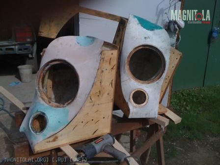 Вот теперь и о главном.Наконец то я закончил работу над коробами.Догнал толщину лицевых стенок до 2х-4х см.Проклеил и залил все щели с боков,зашпатлевал дырки стекляхой и отшлифовал все стенки сабов.Снаружи все стенки были прокрашены эпакситкой во избежания отсыревания оных.