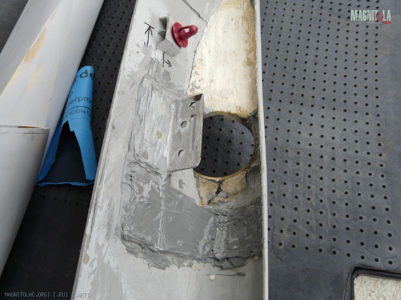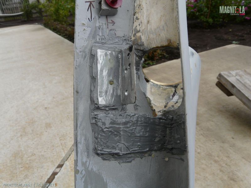 Вобщем решил я придумать для них крепление посерьезнее. Выход нашел такой, вырезал из обычного строительного стального уголка заготовку, тоже угловую, но в размер по стойке, прикрепил поксиполом к стойке, затем для надежности сверху уголок намазал. А чтобы в районе крепежного уголка пластик не прогибался, приклеил еще несколько полосок металла, сверху опять поксипол.