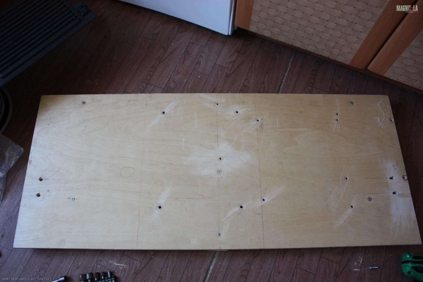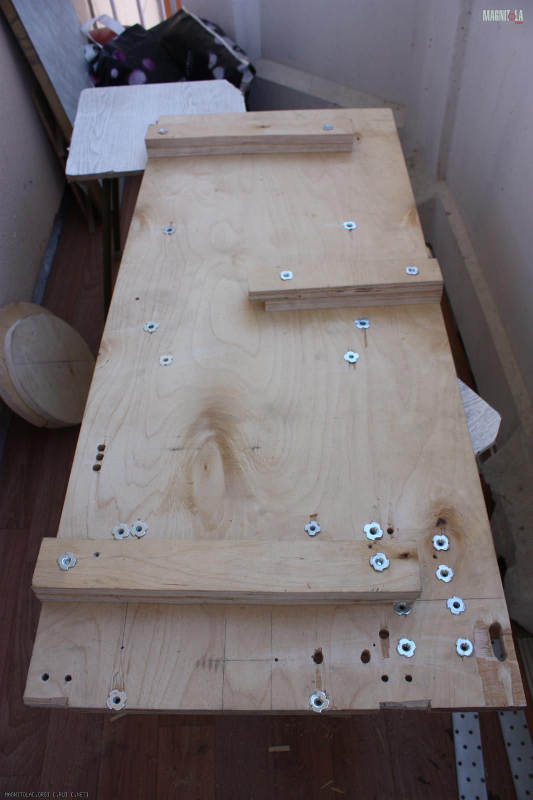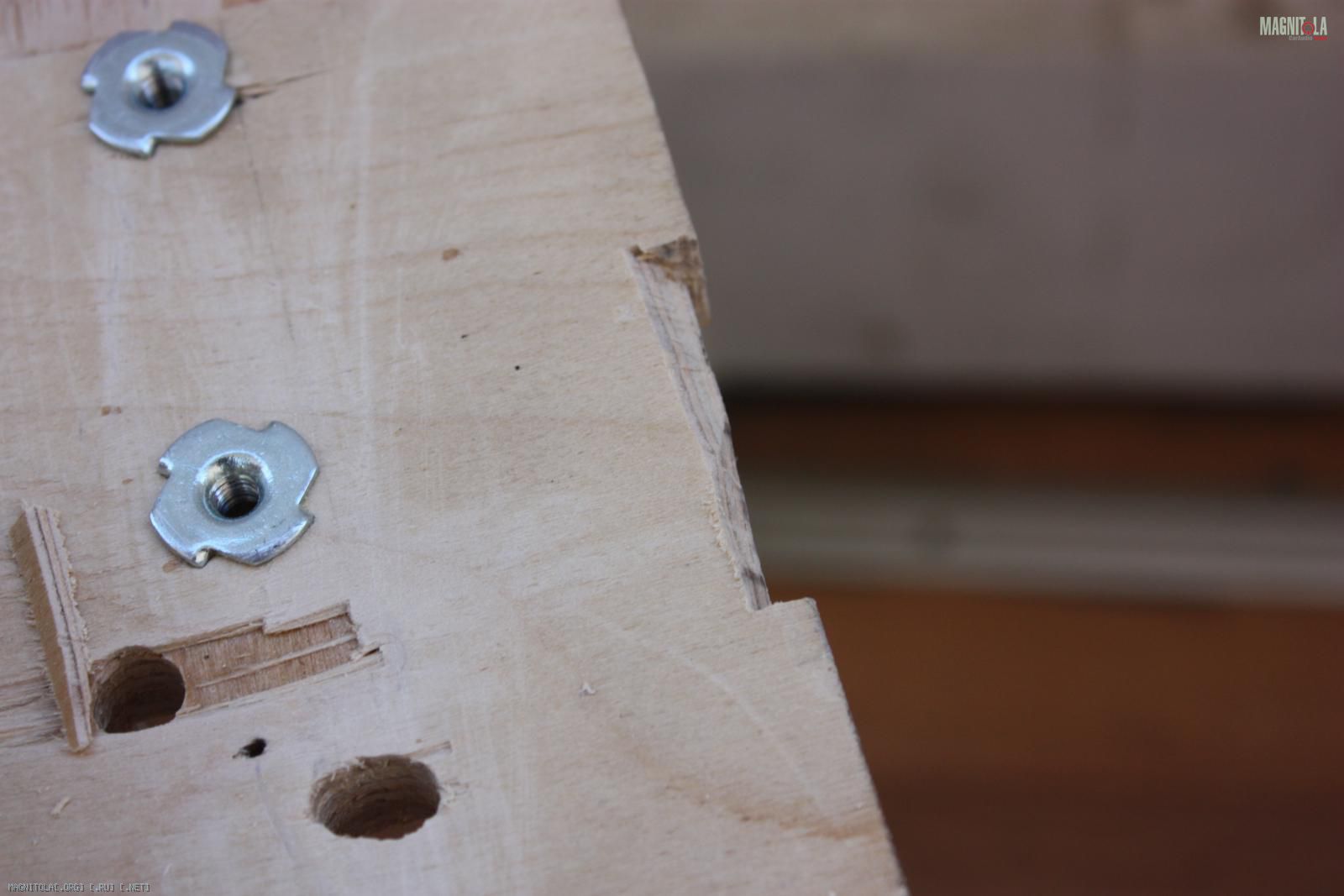 для того что бы пластина не выходила за габариты фальш пола делаем вот такие не врачные на первый вгляд скосы. дальше сверлим отверстия и опять врезные гайки.