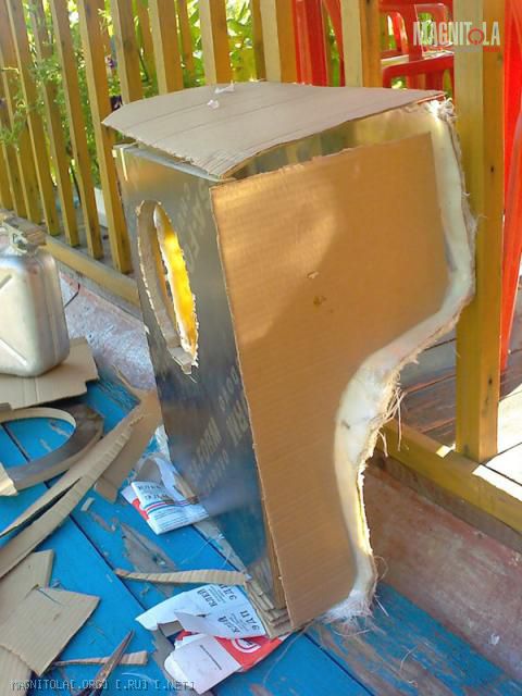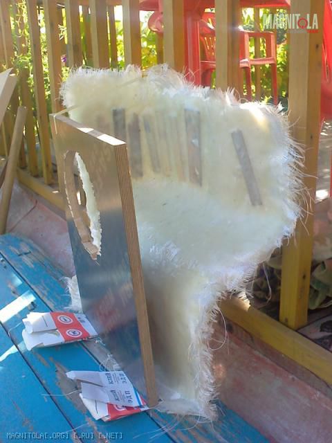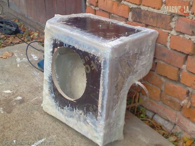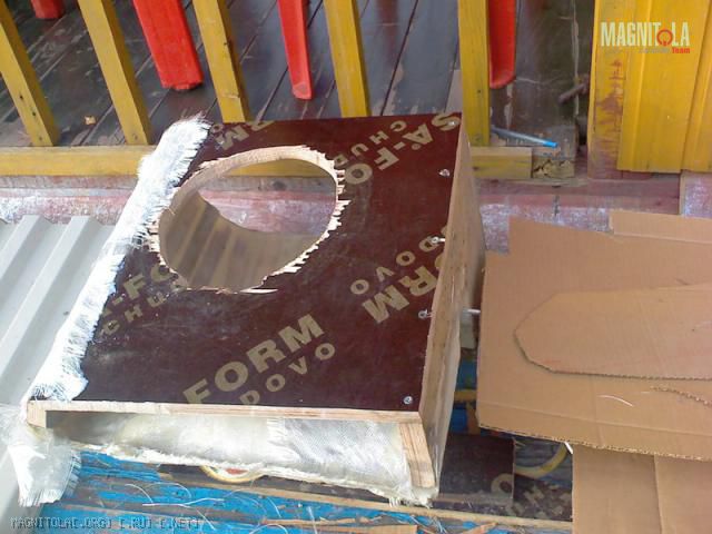Хотелось иметь сабвуфер, но не занимать им значительный объём багажника, поэтому было принято решение изготовить ящик по форме колёсной арки. Материал был выбран соответствующий - стеклоткань. Технология -послойная проклейка ткани эпоксидным клеем по форме, что-то вроде папье-маше. Форма - пластик с арки, оклеил его скотчем - "обычным" и малярным.