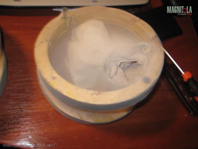 не сильно натянул ? как бы внутрь подиума ушла ткань . потом шпакли много надо будет. попробуй ослабить.