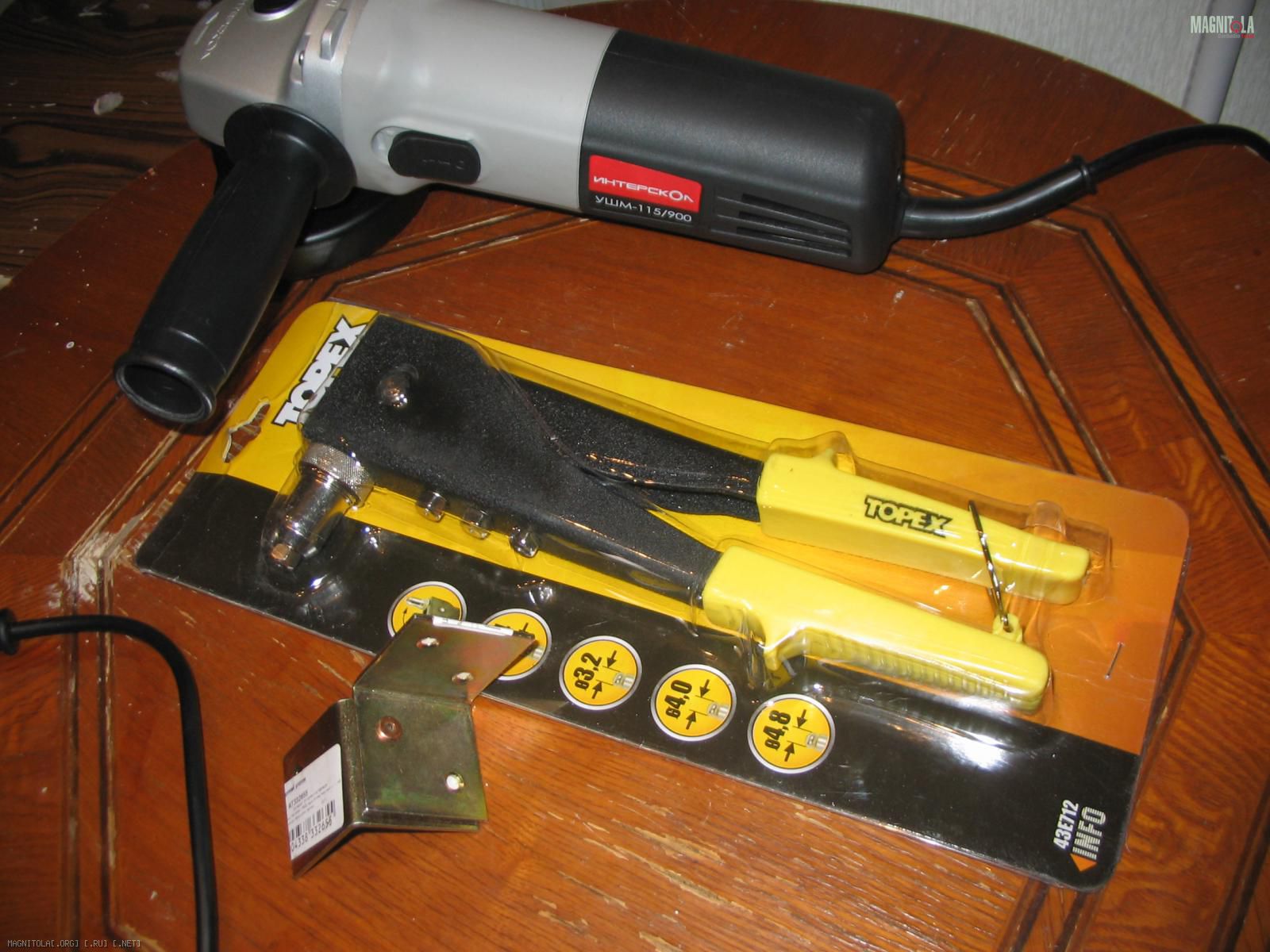 не вынесла душа поэта... Сегодня купил себе болгарку дабы резать уголки и обрабатывать края проставочных колец и сабов :) И мегавещь, не МЕГАВЕЩЬ - заклепочник, цена хреновины копеечная - 200р и заклепок 20шт на 145р, только чую с размером заклепок чуток прогадал. Опробовал - офигенско! Теперь будет на что крепить уголки для под сиденьем для фанерки усилка!!! Спасибо K&K за подсказанную идею в соседней теме, такие вот советы многого стоят! Вот фото ништяков, На фотке видно, что я уже на уголках опробовал клепальник :)