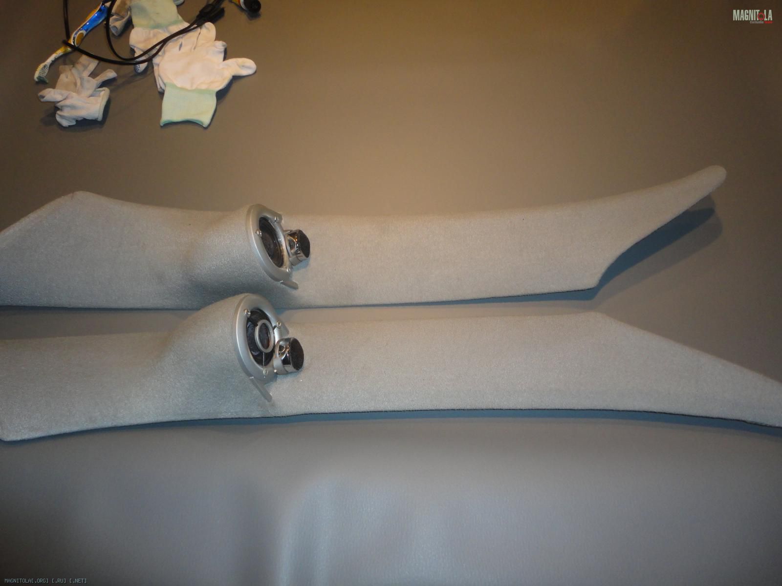 Так что пока только то, на чём остановился ранее. Обрезал ухи динамикам, за 3 литра пива раздобыл более-менее подходящие грили. Чуток доработал их в размер паяльником, напильником и наждачкой. Прикрутил.... пока на саморезы ;) т.к. из-за спонтанности действий сразу не заложил гайки в подиум, чем осложнил чуток задачу. Но это ерунда - решаемо.