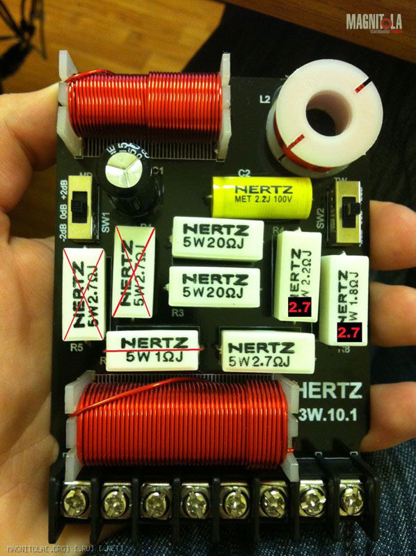 1 ом на СЧ перемычку кинул, 2.7 ом с СЧ перепаял на ВЧ вместо 1,8 и 2.2