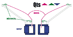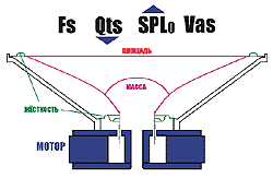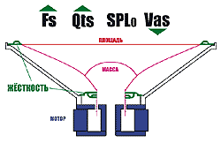 Резонансная частота определяется массой подвижной системы и жёсткостью подвеса, какова площадь диффузора и какой у него привод, этому параметру и дела нет. Цветные стрелки показывают, как будет меняться параметр при росте той или иной конструктивной величины.