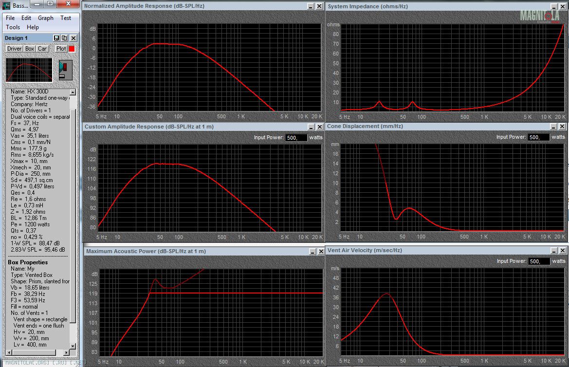 что то Qts=0,4 для этого динамика меня смущает. Сроду у герцов с 2-мя катушками такого низкого значения не встречал! Перепроверь исходные данные.