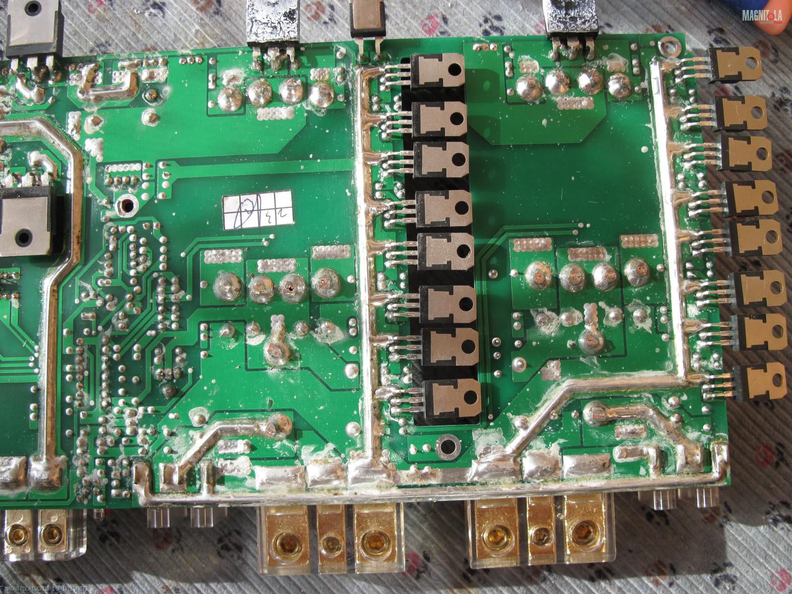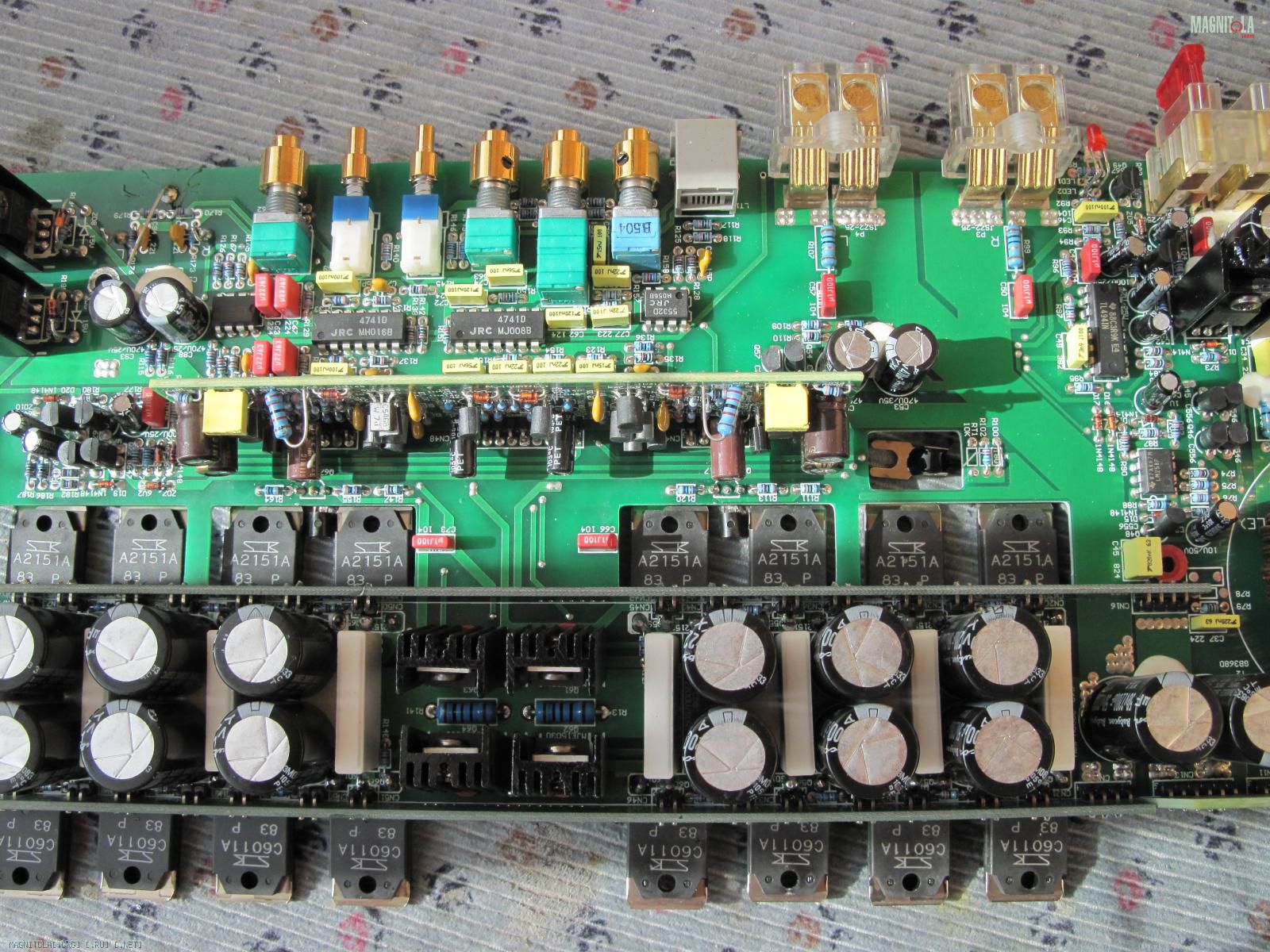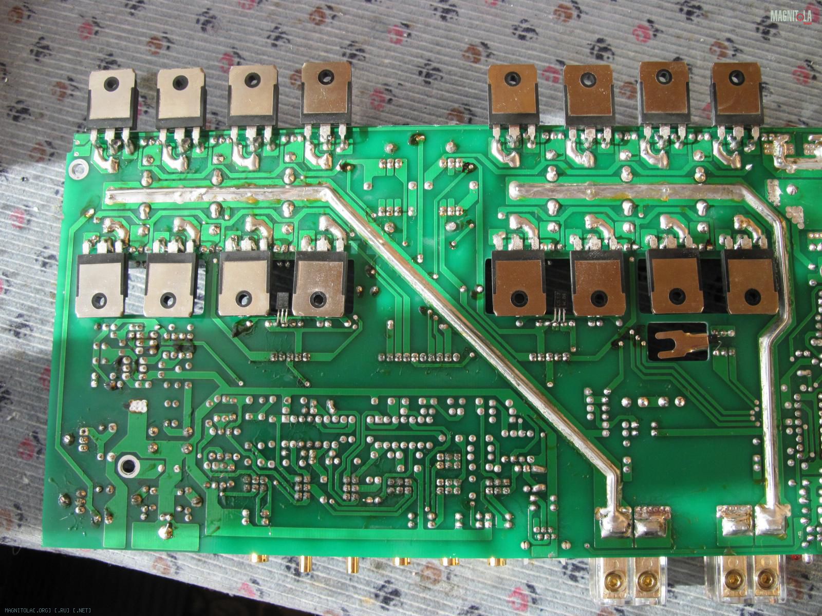всё не чо, хреновая пайка,на нагрузку реагирует ровно(плечи не косят)достаточно просто установить ток покоя,но перед установкой необходимо подождать чють дольше, на всех каналах ДК и УН комплектация одна а напруга +-34 саб,обычные-+26 поэтому дольше выходят если вообще выходят в режим, можно посчитать но это совсем другая история.выхлоп KTD998,KTB778 саб TIP35C/36C.