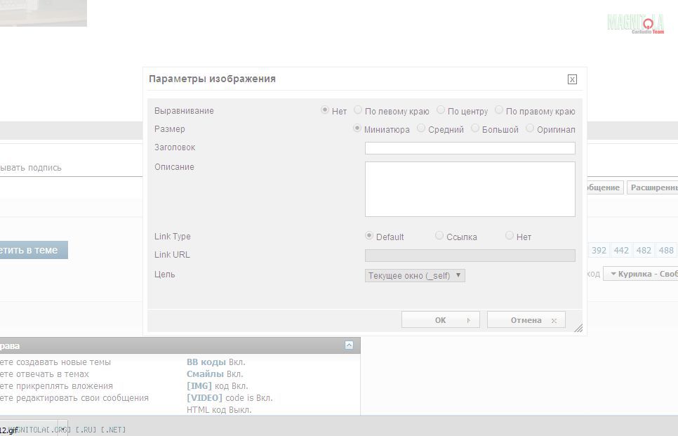 Здесь Вы можете выбрать желательный размер отбражения картинки ее выравнивания в посте.