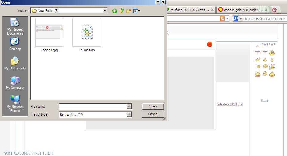4) Выбираем файл, который хотим вставить на форум и открываем его либо двойным кликом по названию файла, либо выделением файла и кнопкой "Открыть" (Open)