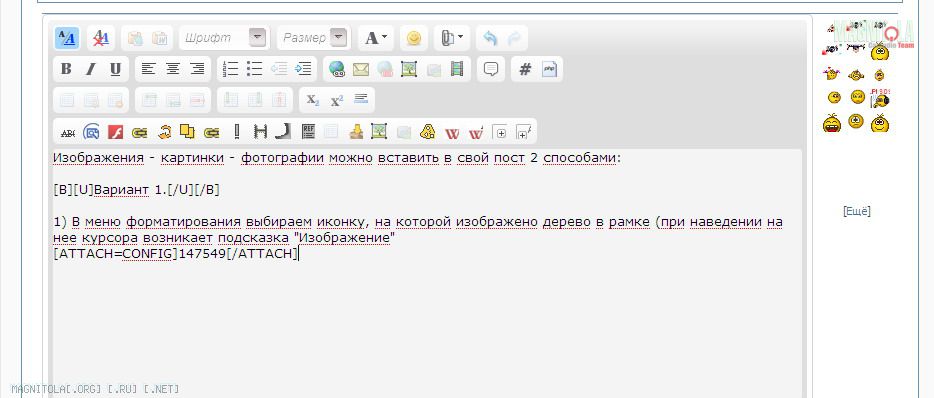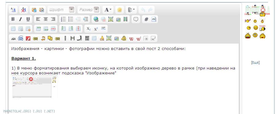 1) В меню форматирования выбираем иконку, на которой изображено дерево в рамке (при наведении на нее курсора возникает подсказка "Изображение"