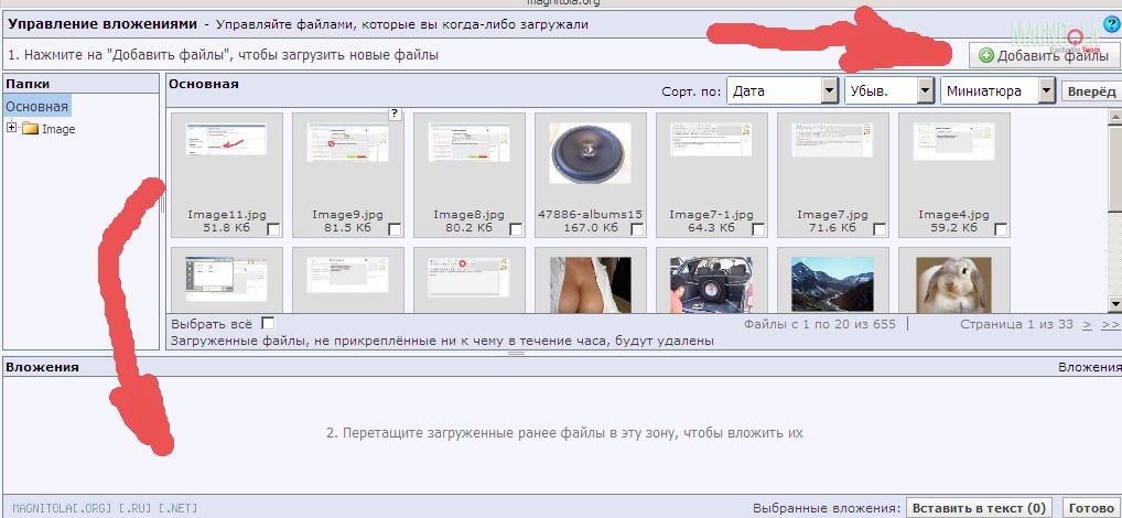2) В новом окне либо выбираете одну из ранее загруженных картинок и перетаскиваете ее в нижнее поле, либо нажимаете на кнопку "Добавить файлы" в правом верхнем углу и загружаете файл со своего компьютера или по ссылке из Интернета.