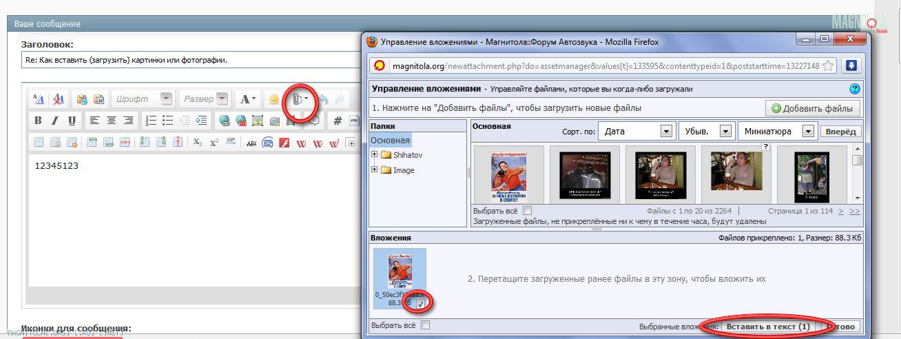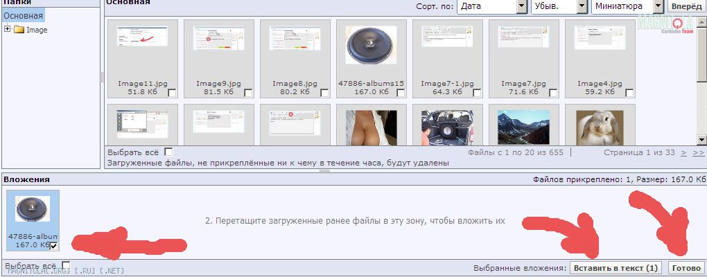 3) Помечаете галочками те файлы, которые хотите прикрепить в пост, жмете в правом нижнем углу кнопки "Вставить в текст" и затем - "Готово".