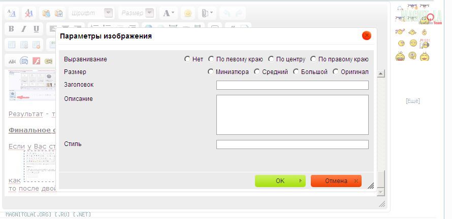 Здесь Вы можете выбрать желательный размер отбражения картинки ее выравнивания в посте.