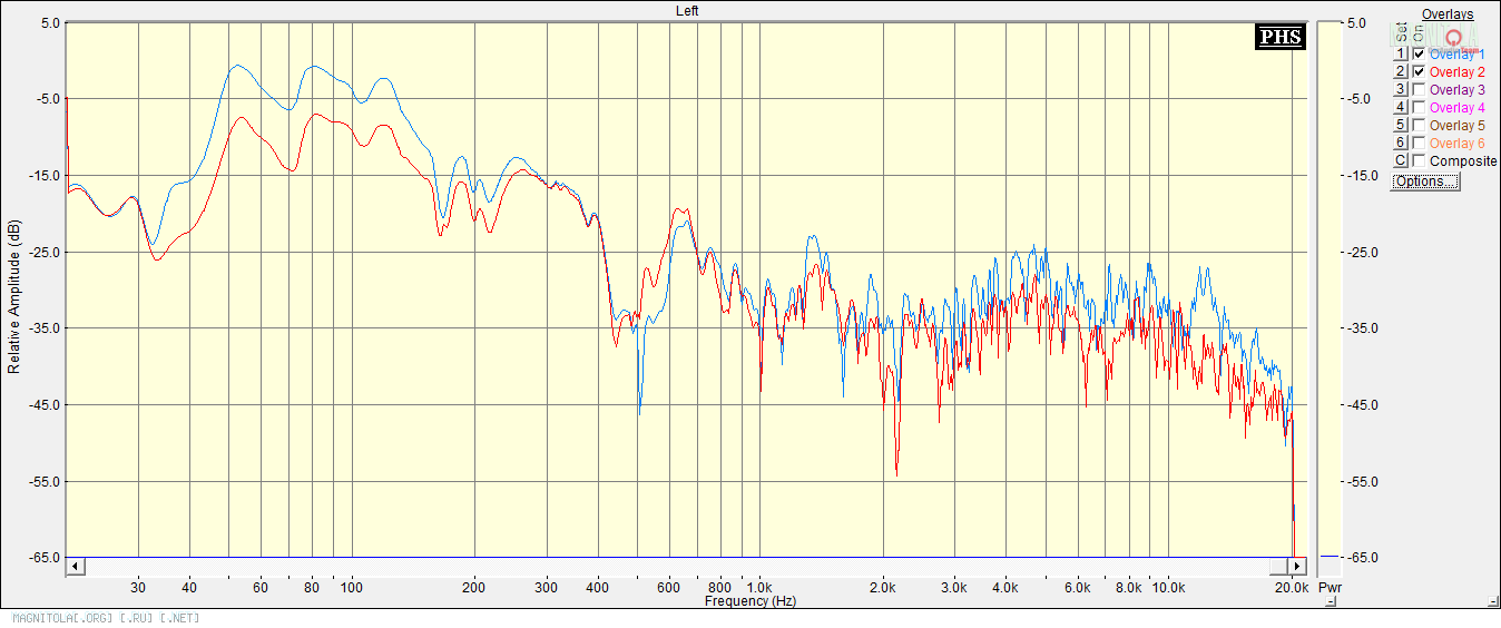 Комент по АЧХ. Система без саба, кривульки от 0 до 35Гц - ни что иное, как внешние шумы. Мид играет 50Гц/24db - 2500/12db, пищ играет 3150/12db и выше. Мид играет из-за штатной сетки, отсюда и неравномерность красного графика от 300Гц до 2кГц и необходимость придушаить пищ для возможности согласования его с мидбасом на СЧ, чтобы голоса были более-менее тонально точными. Но вот откуда при воспроизведении с USB взялся гундосый подъём на басе и ВЧ - не понимаю. Вернее, не то, чтобы не понимаю... Но принимать такую несправедливость отказываюсь. Ведь, что самое обидное - это даже дурацким графическим эквалайзером пиона не особо-то поправишь! То есть, настроить систему, чтобы она хорошо играла ВАВки - практически нереально. Если только не иметь мидбасы с задранной серединой и проваленным басом...