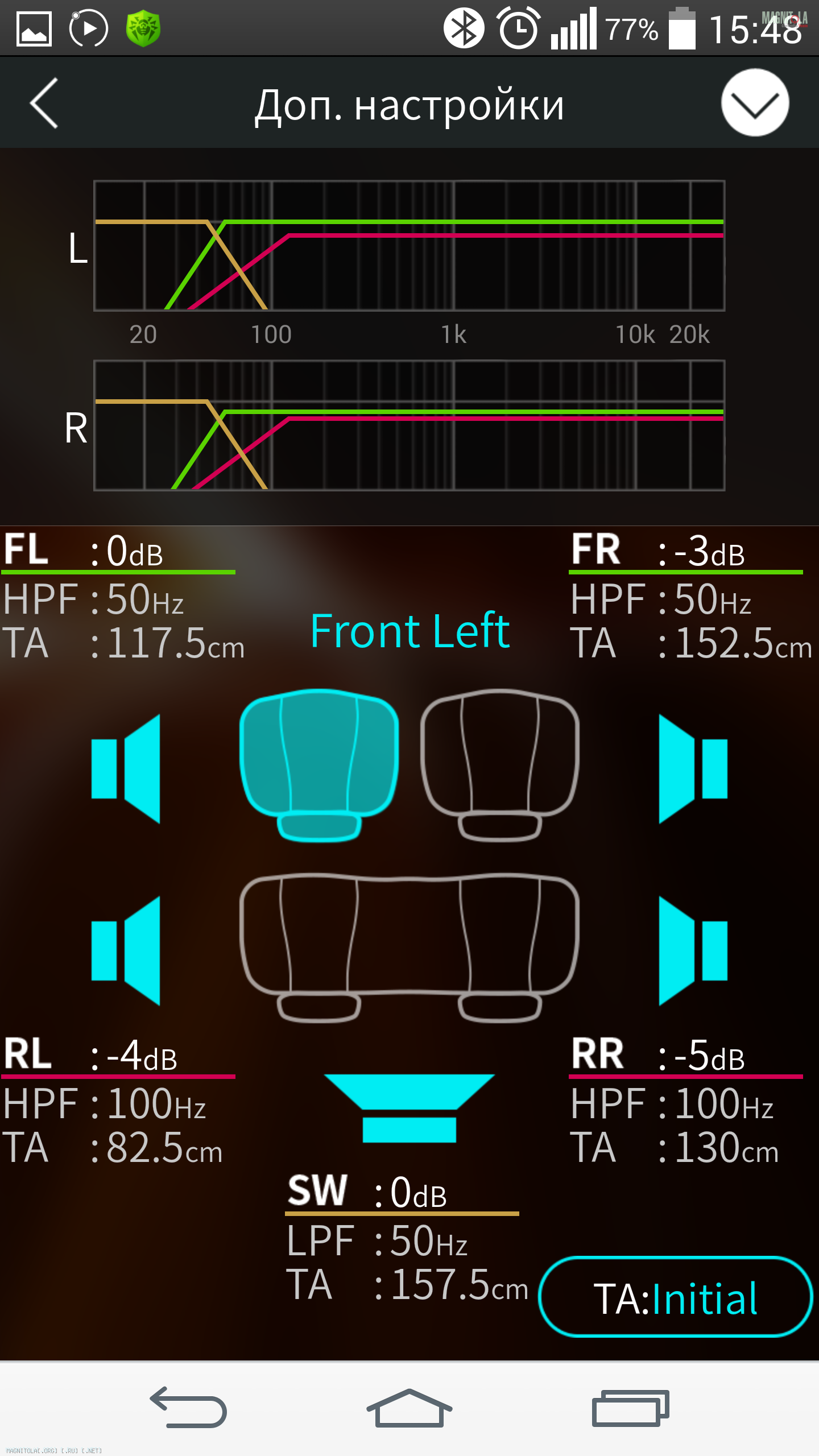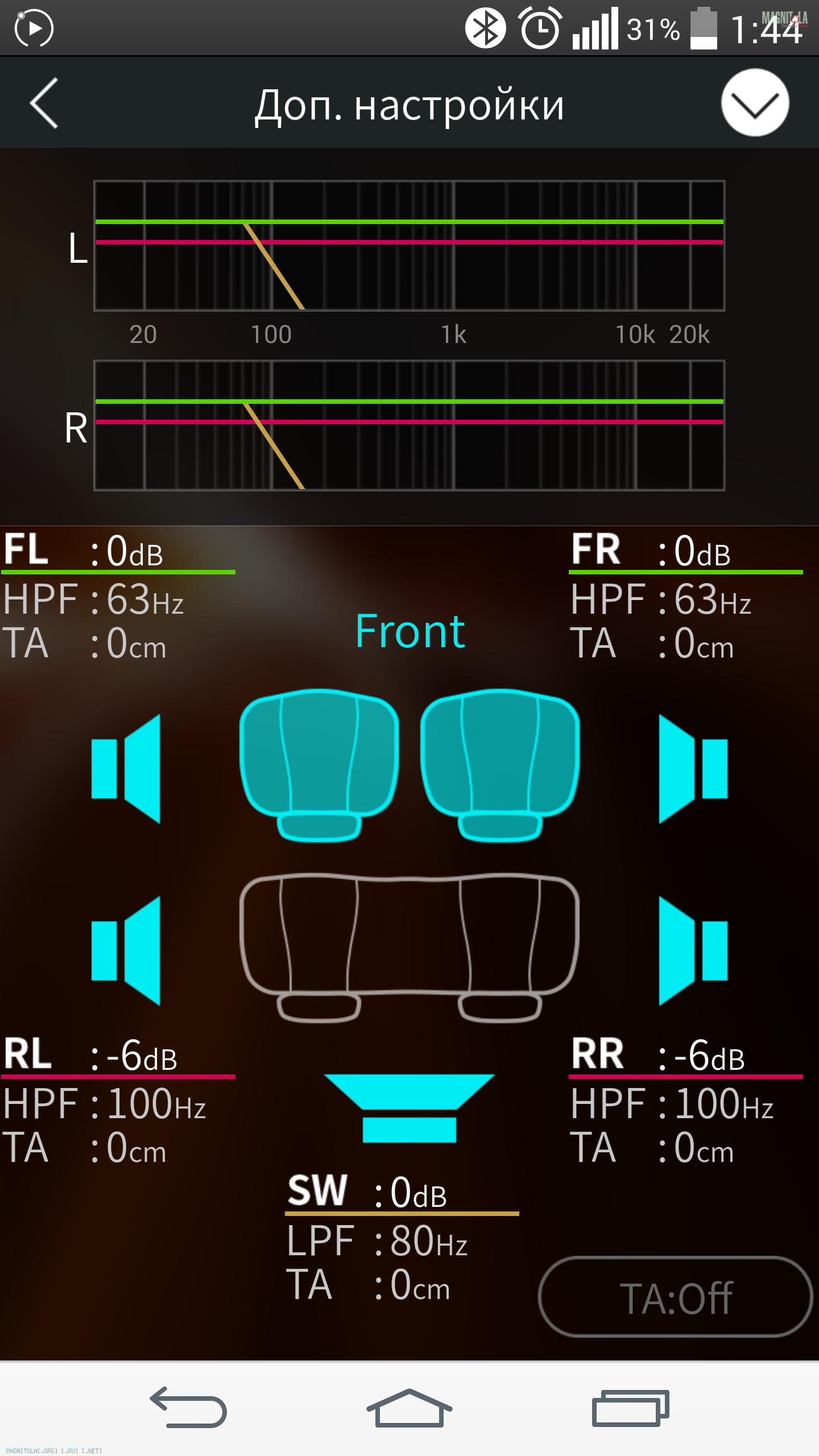 Поделюсь наблюдениями выбора позиций. Впозиции front left выставил все нули, speaker level одинаковый во всех позициях. В меню выбора позиции листаю между front, left front, off. Звук остается неизменным ( EQ по нулям все). Потом кручу настоеньки TA в front left. Все остается неизменным ( кросоверы, эквалайзер и тд и тп). Начинаю выбирать позиции, так вот в позициях off, front left, front звучание отличается очень отчетливо. Все же настройки TA в одной позиции влияет на остальные кроме off. Вообщем имхо мафон этот так баловство, ширпотреб.