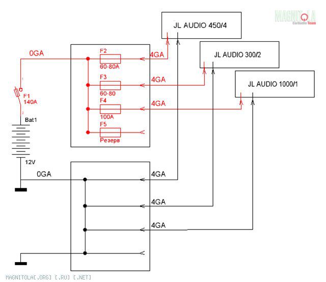 Добрый вечер ,хотелось бы посоветоваться в организации питания усилителей. В общем имеется кабель сечение 0 га который проложен на "+" и "-". К нему нужно подключить 3 усилителя: на фронт ВЧ и СЧ - JL AUDIO 450/4 , НЧ - JL AUDIO 300/2 и на саб JL AUDIO 1000/1