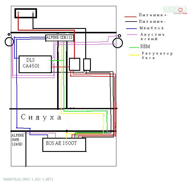 REM через реле и кнопки включения на усилки по центру, регулятор баса тоже по центру.