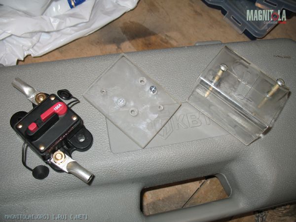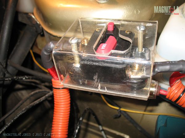 Пиветствую Всех форумчан! Причина столь неординарного решения - замены главного предохранителя системы у АКБ на автомат - токовые утечки в выключенном состоянии. Нет сил больше каждый раз уходя из гаража отключать "-" клемму АКБ... Отключил автомат и порядок. Сразу оговорюсь - девайсы по усилителям - не Синфони и не Стег - поэтому может и грешат они током покоя... Панелька на магнитоле - снимается уходя...