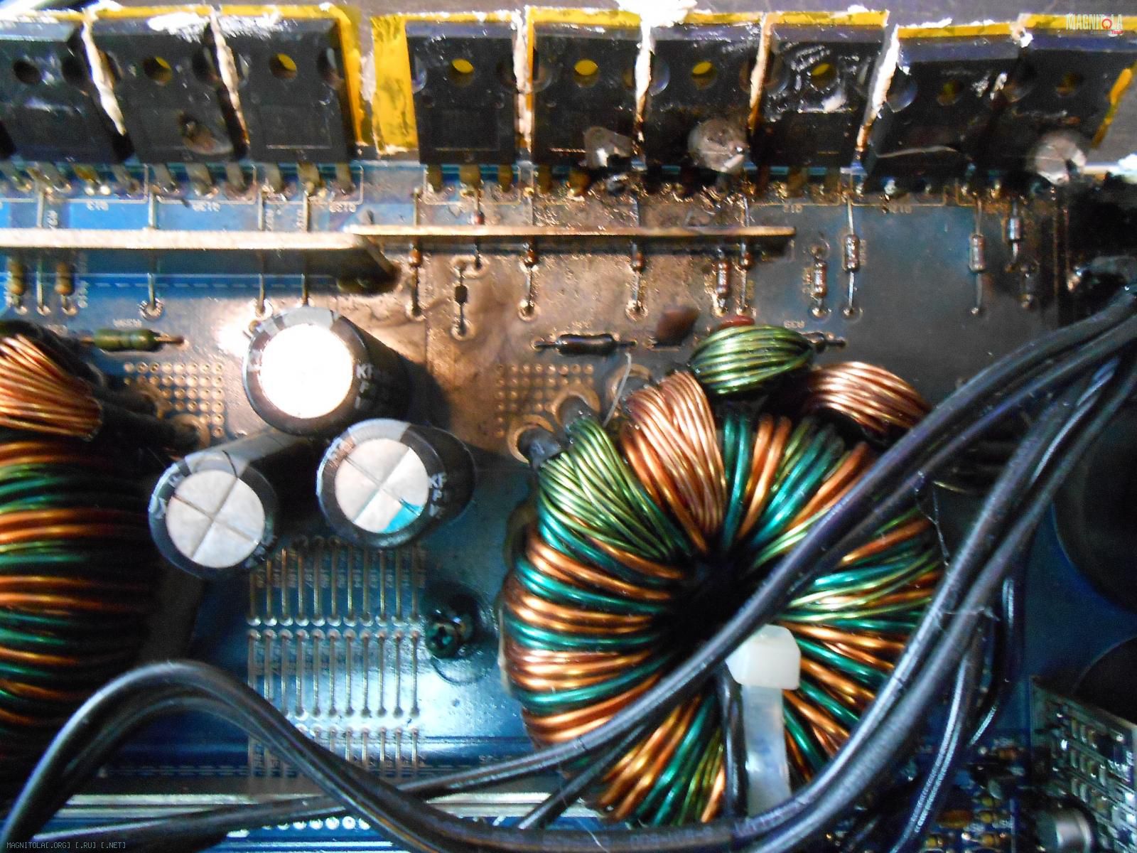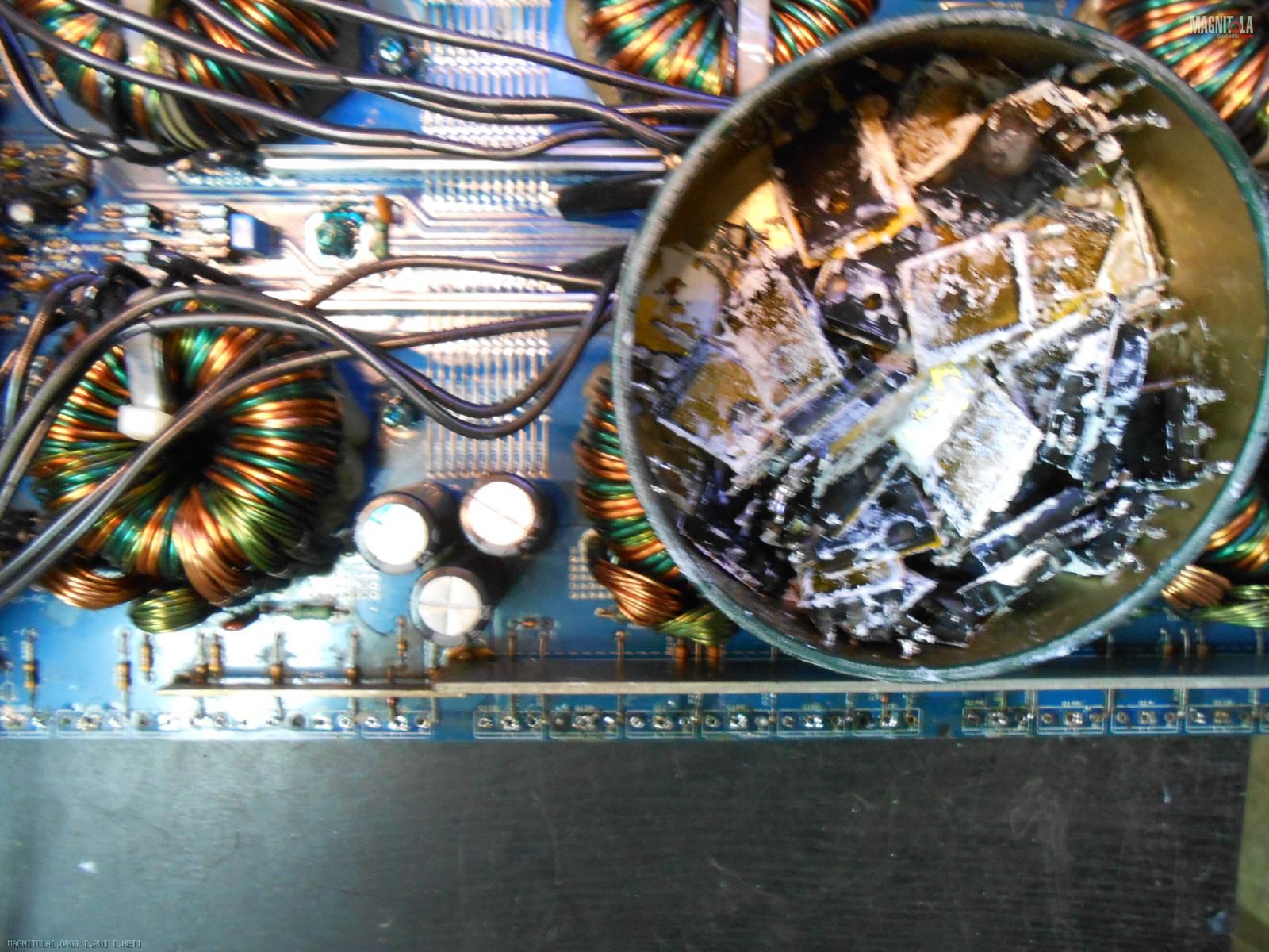 Это понятно,процесс выхода из строя ключевых транзисторов не всегда превышает ток,который возникает при этом-внутри усилителя происходит цепная реакция(выход из строя одного транзистора, тянет за собой соседние и как такового полного КЗ не возникает при этом).Дыма и огня много,но это в рамках разумного для предохранителей,в большей части это перегрев и такие фейерверки наблюдаются,а потом видим такую картину: